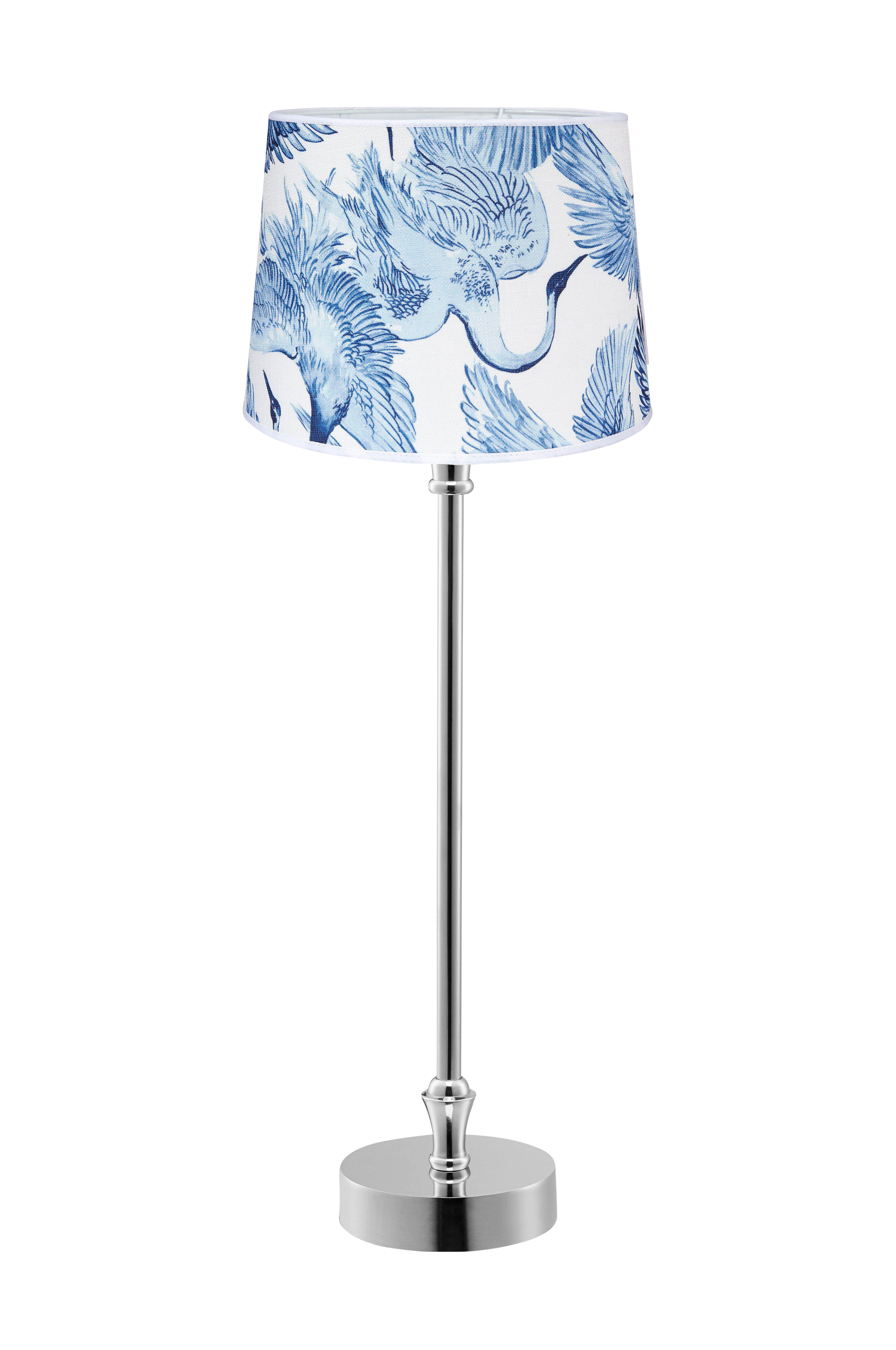 Liam lampefod med kromfinish, sammen med lampeskærmen sofia i mønstret stof. Skærmen er 20 cm bred og 15,5 cm høj og har en fast e27-kardan. Lampefoden er 46 cm høj, og den samlede højde er 59 cm. E27-fatning. Max 40w. Sort plastledning 150 cm. Lyskilde ikke inkluderet.