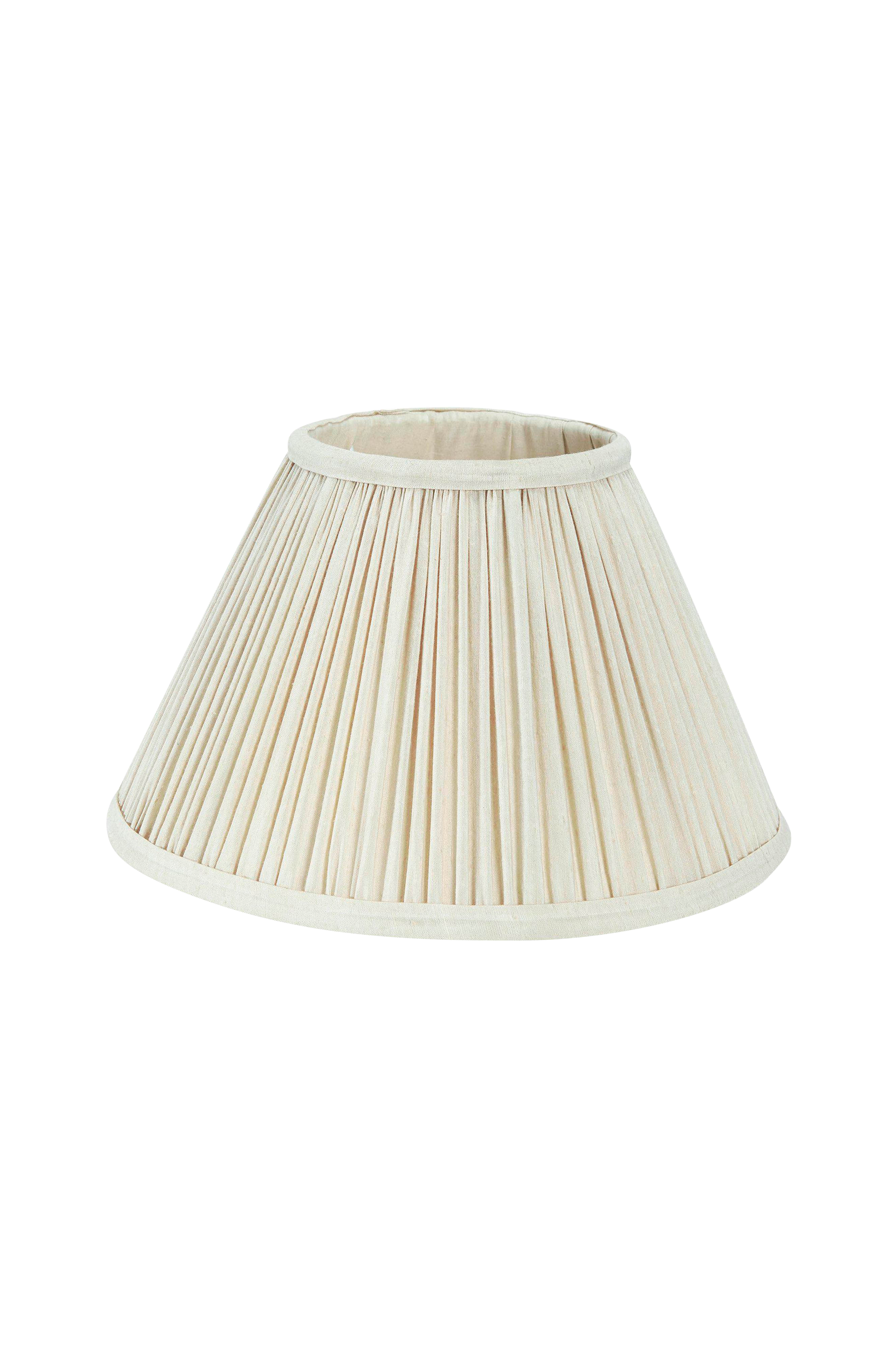 Stella lampeskærm i rynket silkelook foret med bomuldsstof i samme farve. En klassisk model, som er smuk både på en trendy lampefod og på en klassisk bordlampe. Lampeskærmen er konisk og udstyret med en E27-bærering som sidder ca. 2,5 cm fra kanten forneden på skærmen. Højde 20 cm, bredde forneden 35 cm, bredde foroven 16 cm.