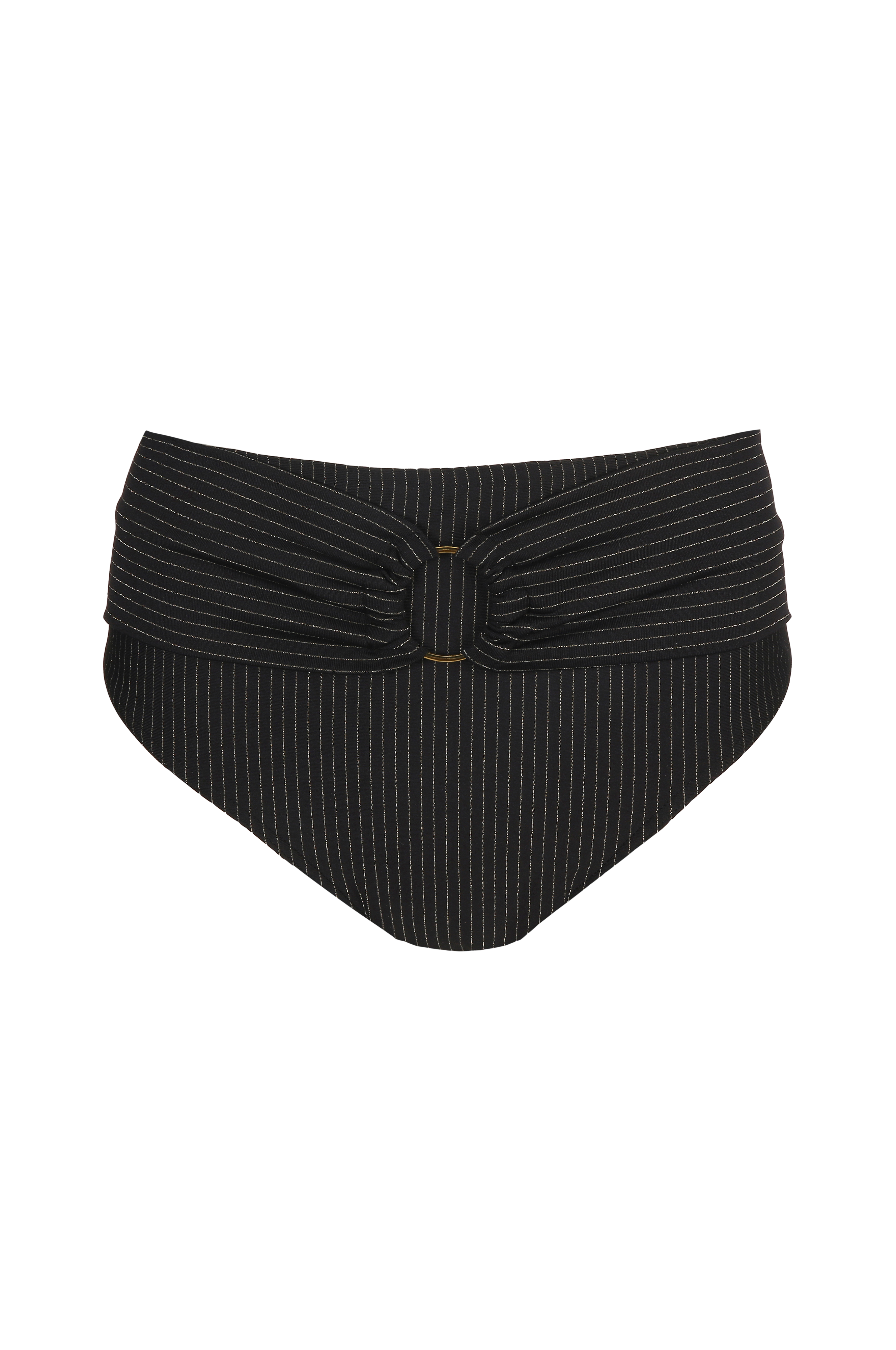 • Høj talje med strop og dekorativ ring foran• Guldglitrende striber• Forede