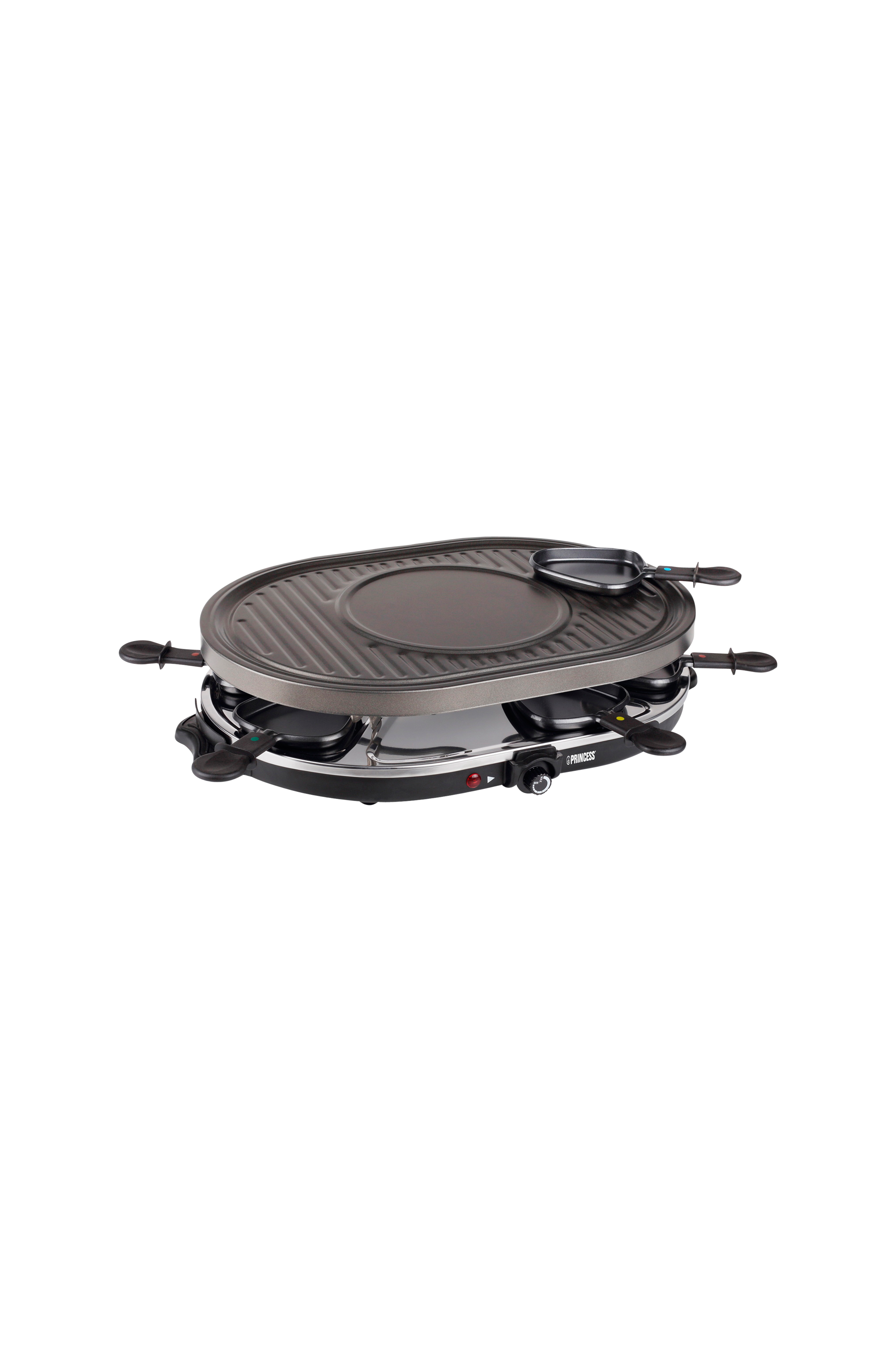 En 5-i-1 raclette og grill med 8 pander og aftagelig oval grillplade til kød, fisk og grøntsager uden smør eller olie. Funktioner omfatter stålplader, integreret crepejern, justerbar termostat, nonstick-spatler, Cool Touch-håndtag, skridsikre fødder og strømindikatorlys. Let at rengøre med stor stegeflade på 43x30 cm. Leveres med 2 m strømkabel og 1200 W effekt.