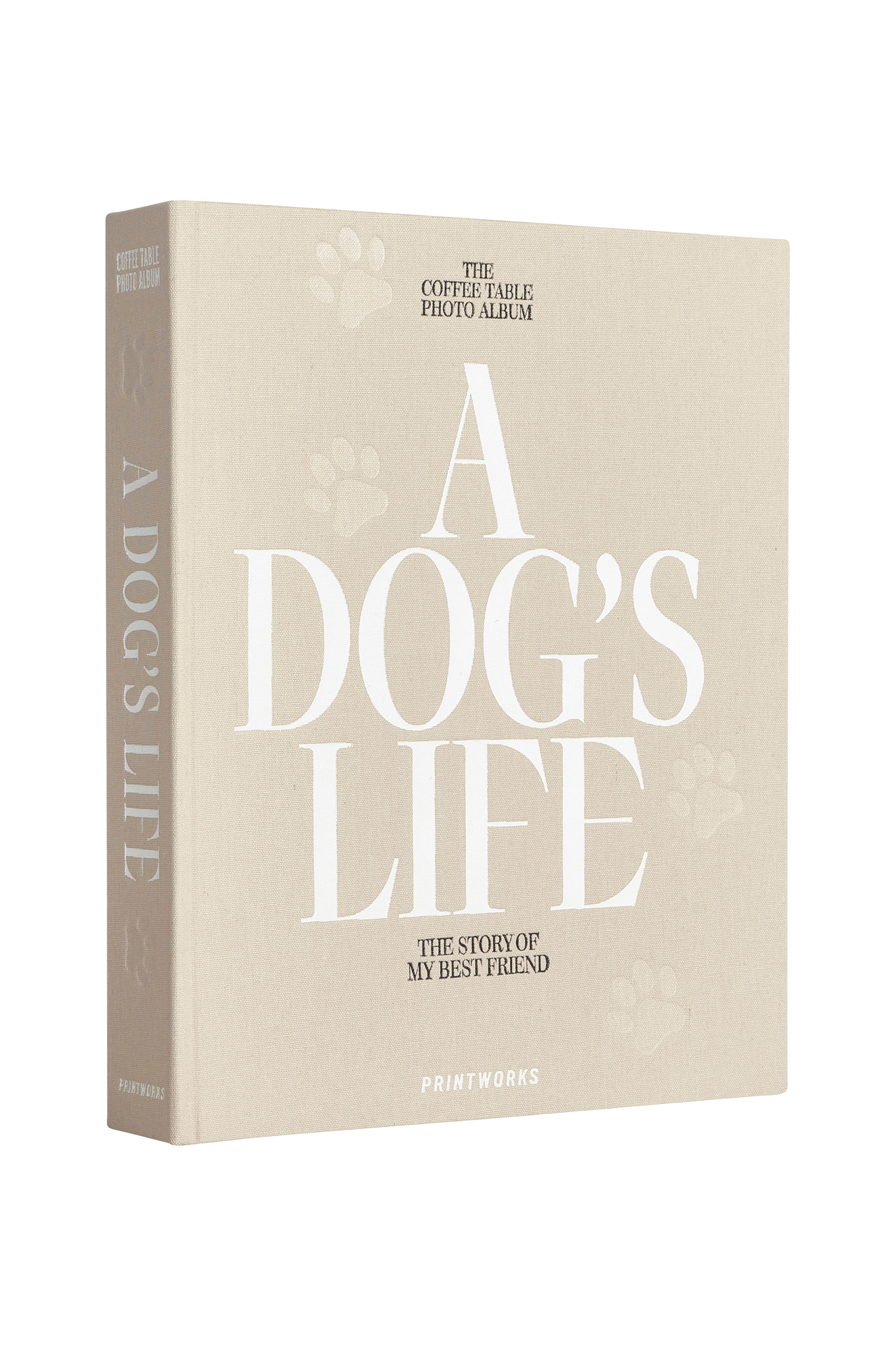 Oplev vores første fotoalbum dedikeret til din firbenede bedste vens liv. "A Dog's Life" har et smukt beige stofomslag med hvid tekst. Indeni finder du 30 sider hvidt fotopapir af høj kvalitet, så du nemt kan sætte dine fotos fast med vores klistermærker eller fotohjørner, som købes separat. Der er plads til to fotografier på 10x15 cm på hver side, og der er plads til personlige noter nedenunder. Hvis du har brug for flere sider, kan du bestille ekstra fotopapir (stort). Bemærk dog, at albummet maksimalt kan rumme 40 sider. Fotopapirets størrelse er 28x21 cm.