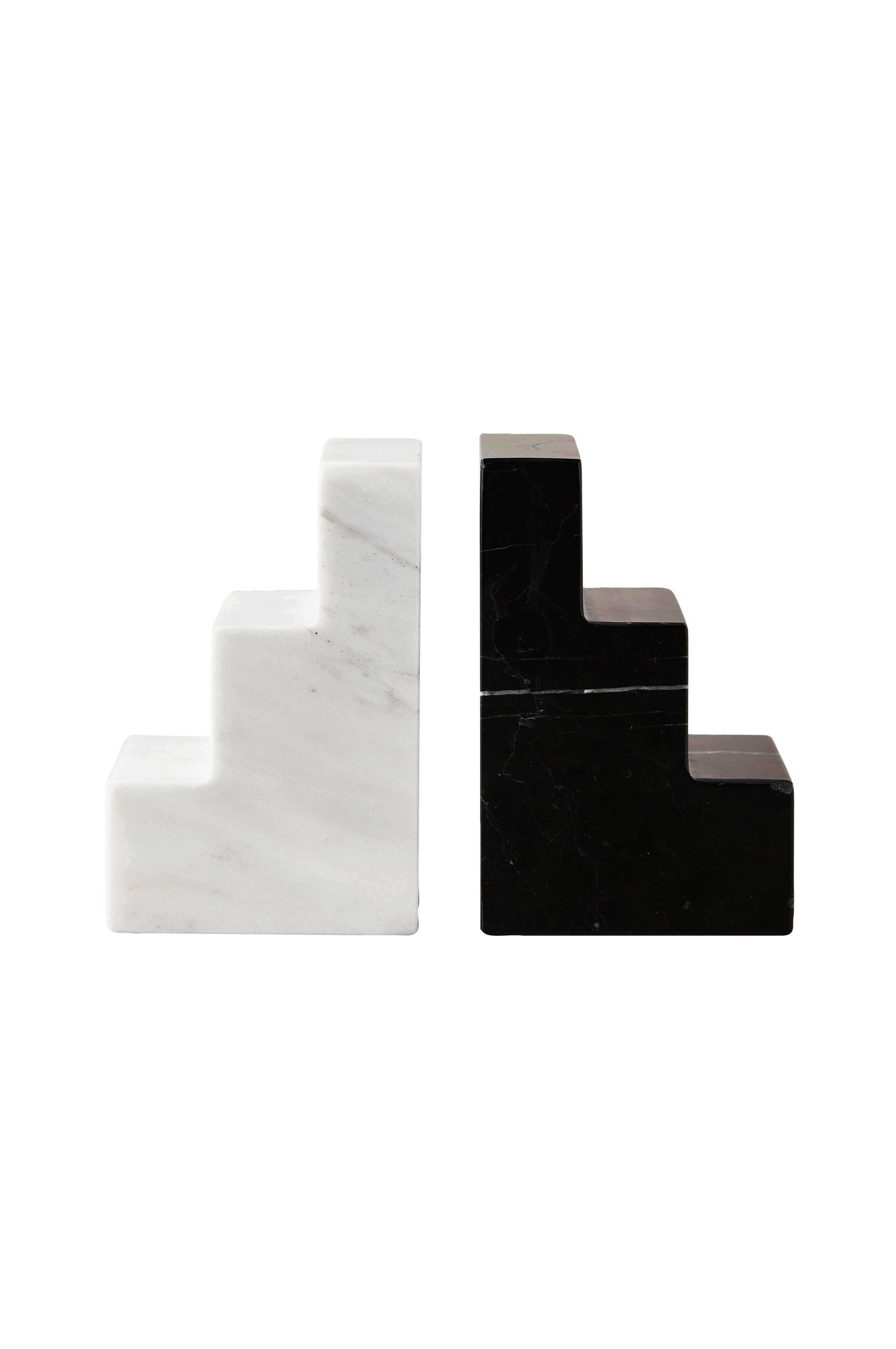 Alsidige bogstøtter i natursten. Brug dem til at støtte dine bøger i flotte rækker, eller sæt dem sammen som en dekorativ indretningsdetalje på et sofabord eller en hylde. Vi kalder bogstøtten for Stair Cube pga. dens evne til at forme en trappe eller en kube, afhængigt af, hvad du ønsker. Dette sæt er fremstillet af sort og hvid marmor og kommer i 2-pak. Bemærk, at hver af støtterne er skåret af forskellige dele af stenen, så hvert par er unikt og kan variere i udseende. Højde 9 cm, bredde 6 cm og dybde 6 cm.