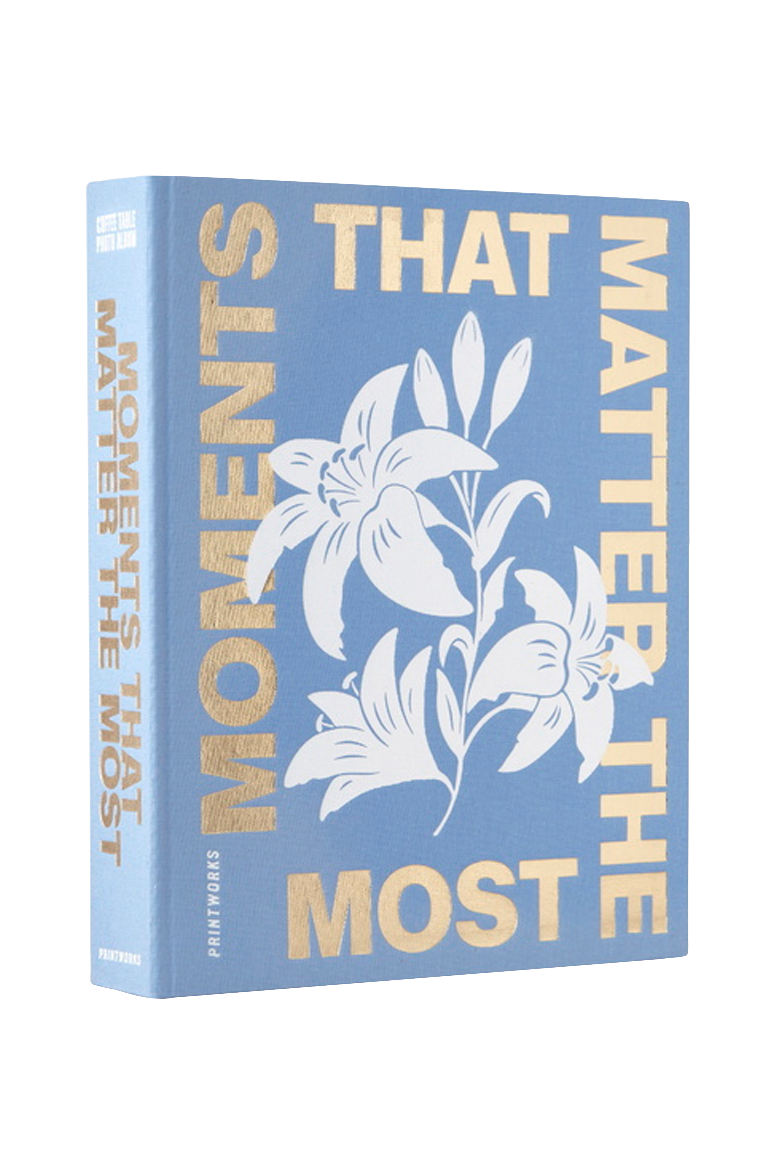 Oplev vores fotoalbum "Moments that matter the most" med et elegant himmelblåt stofomslag med guldfolieret tekst. Indeni finder du 30 sider med fotopapir i høj kvalitet, så du nemt kan sætte dine fotos fast med vores klistermærker eller fotohjørner, som købes separat. Der er plads til to fotografier på 10x15 cm på hver side, og der er plads til personlige noter nedenunder. Hvis du har brug for flere sider, kan du bestille ekstra fotopapir (large). Bemærk, at albummet maksimalt kan rumme 40 sider.