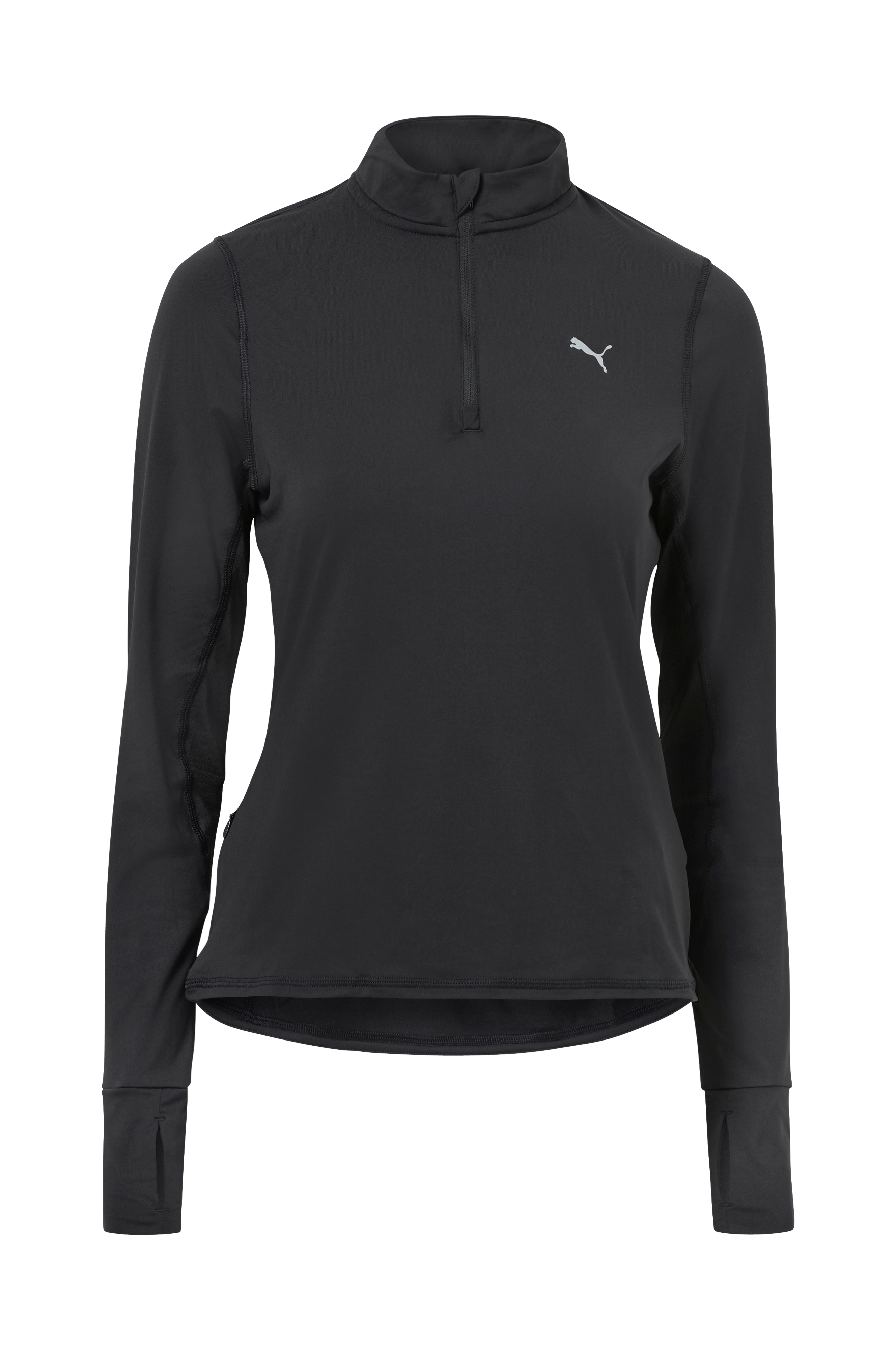 Løbetop / træningstop i stretchjersey med dryCELL som transporterer fugt væk. Høj krave og kort lynlås. Lomme med lynlås i den ene side. Ribkanter i ærmekant med hul til tommelfingeren. Længere bagpå med afrundet kant forneden. Refleksdetaljer foran og bagpå.