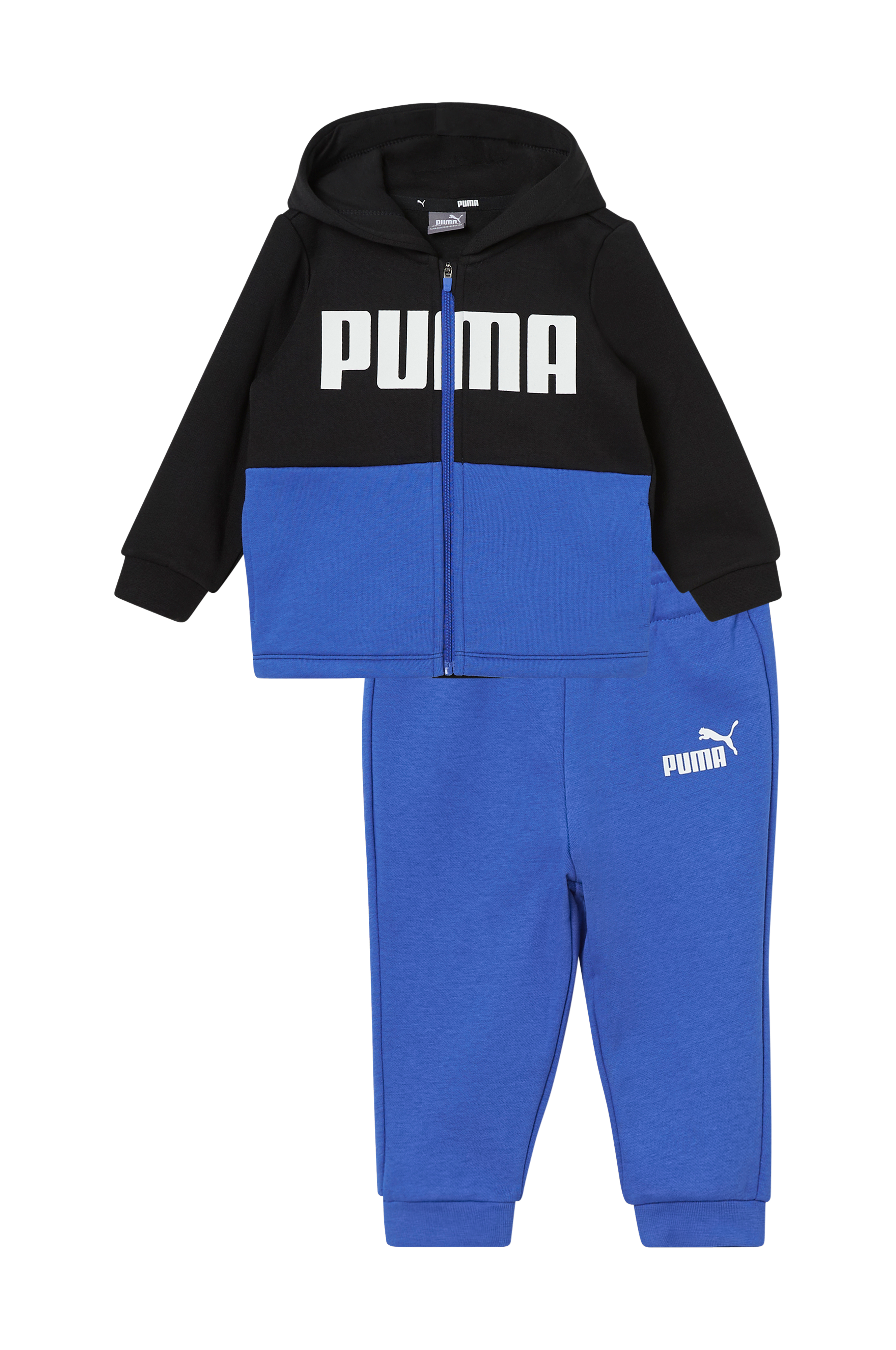 2-delt sæt med blød, børstet inderside. Hættetrøje med lynlås og printet logo foran. Ribkanter i ærmerne. Bukser med elastisk talje og ribkant i benkant.