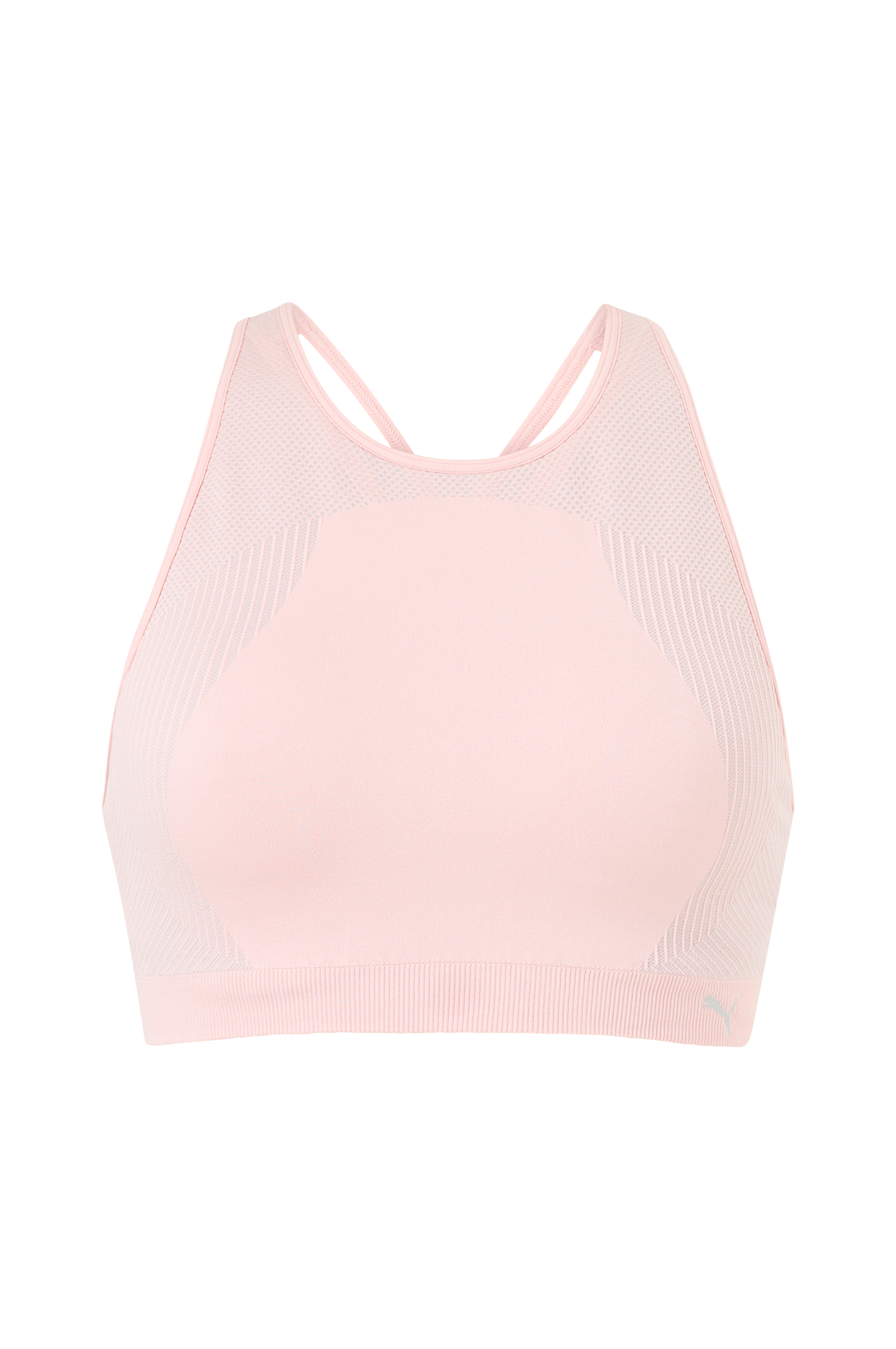 Sports-bh i sømløs model med support-strikkede partier som giver skøn støtte. Dobbelte, krydsede bånd i ryggen og ribkant forneden. Hurtigtørrende funktionsmateriale dryCELL som transporterer fugt væk fra huden.