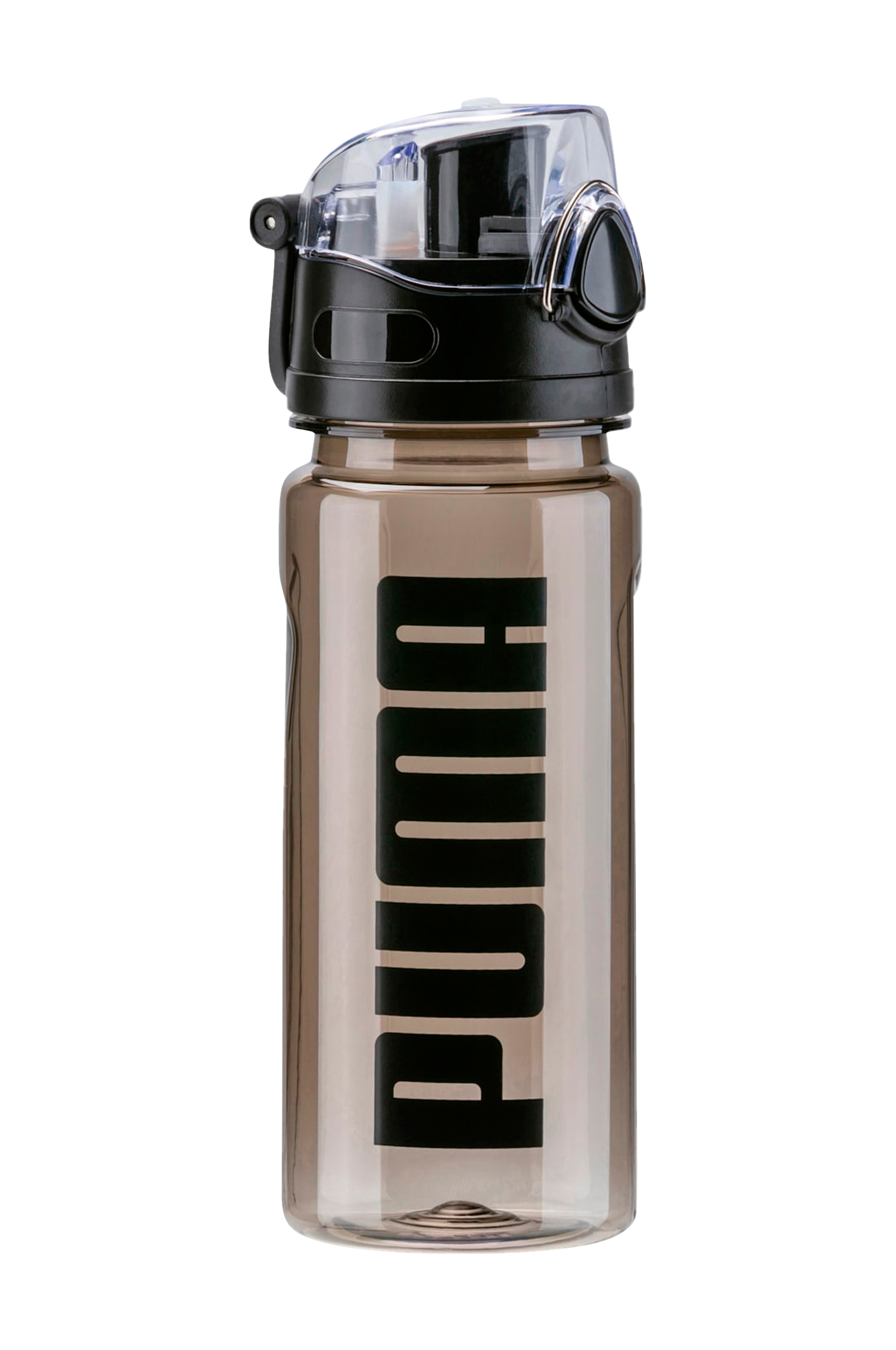 Vandflaske Puma TR Bottle Sportstyle i transparent, slidstærkt plastmateriale med printet Puma-logo. Spildsikkert låg, der åbnes med et klik. Strop foroven som fungerer både som holder og bærehåndtag. Rumfang 600 ml.