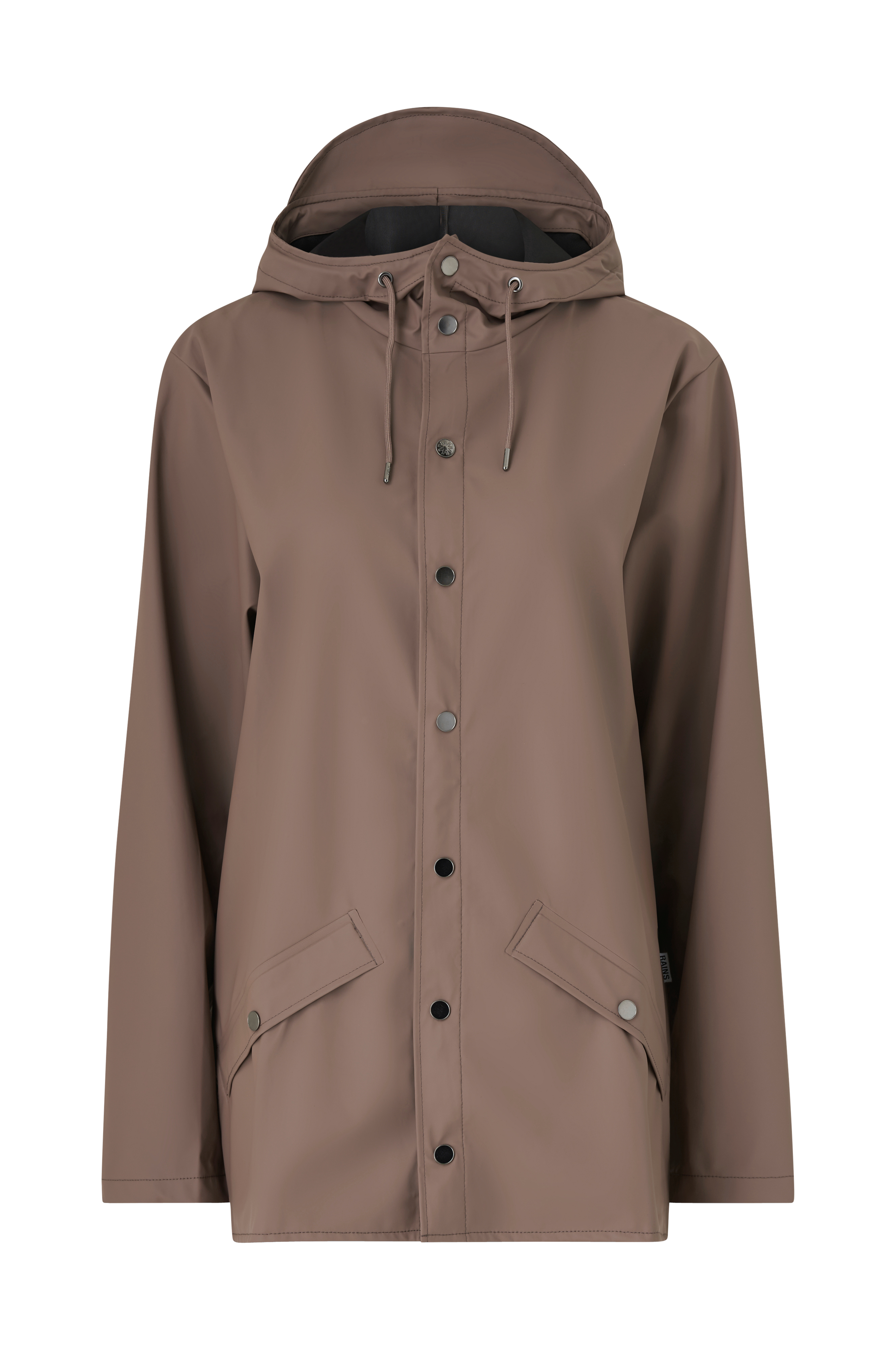 Regnjakke fra Rains med normal pasform og som også er unisex. Jakken føles let og har en vandtæt samt mat overflade. To sidelommer med knap og hætte med justerbar løbegang.