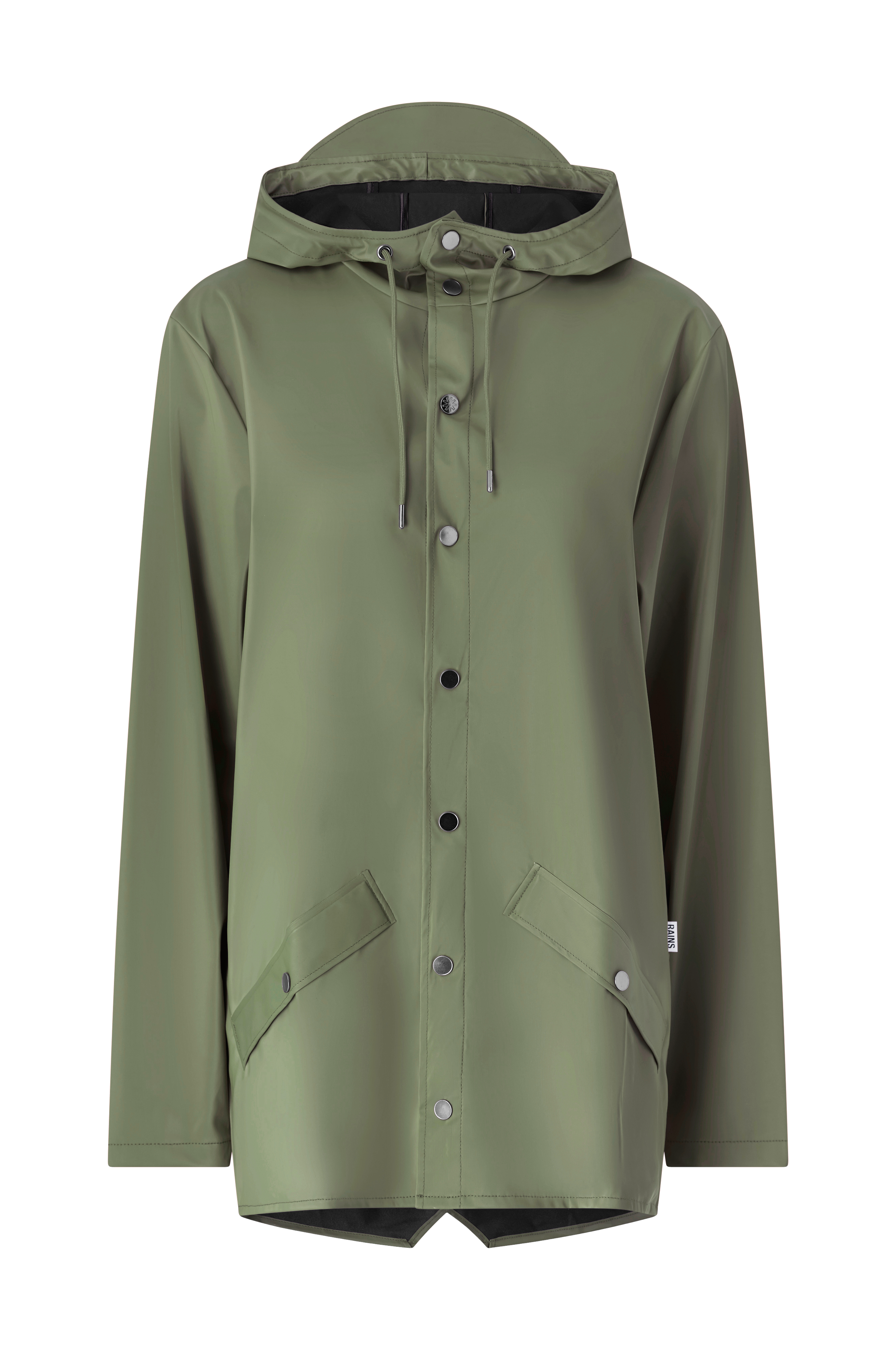 Regnjakke fra Rains med normal pasform og som også er unisex. Jakken føles let og har en vandtæt samt mat overflade. To sidelommer med knap og hætte med justerbar løbegang.