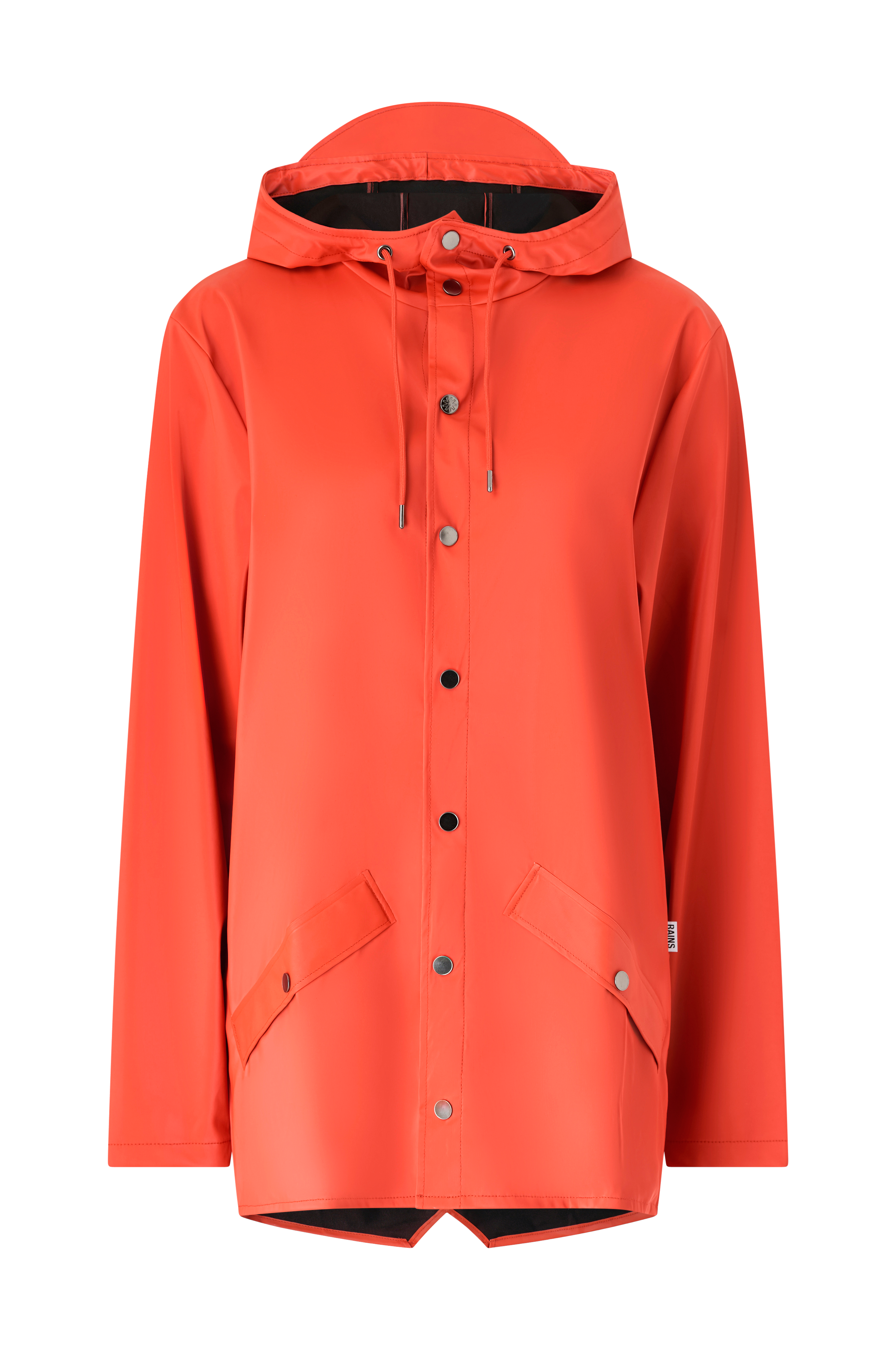 Regnjakke fra Rains med normal pasform og som også er unisex. Jakken føles let og har en vandtæt samt mat overflade. To sidelommer med knap og hætte med justerbar løbegang.