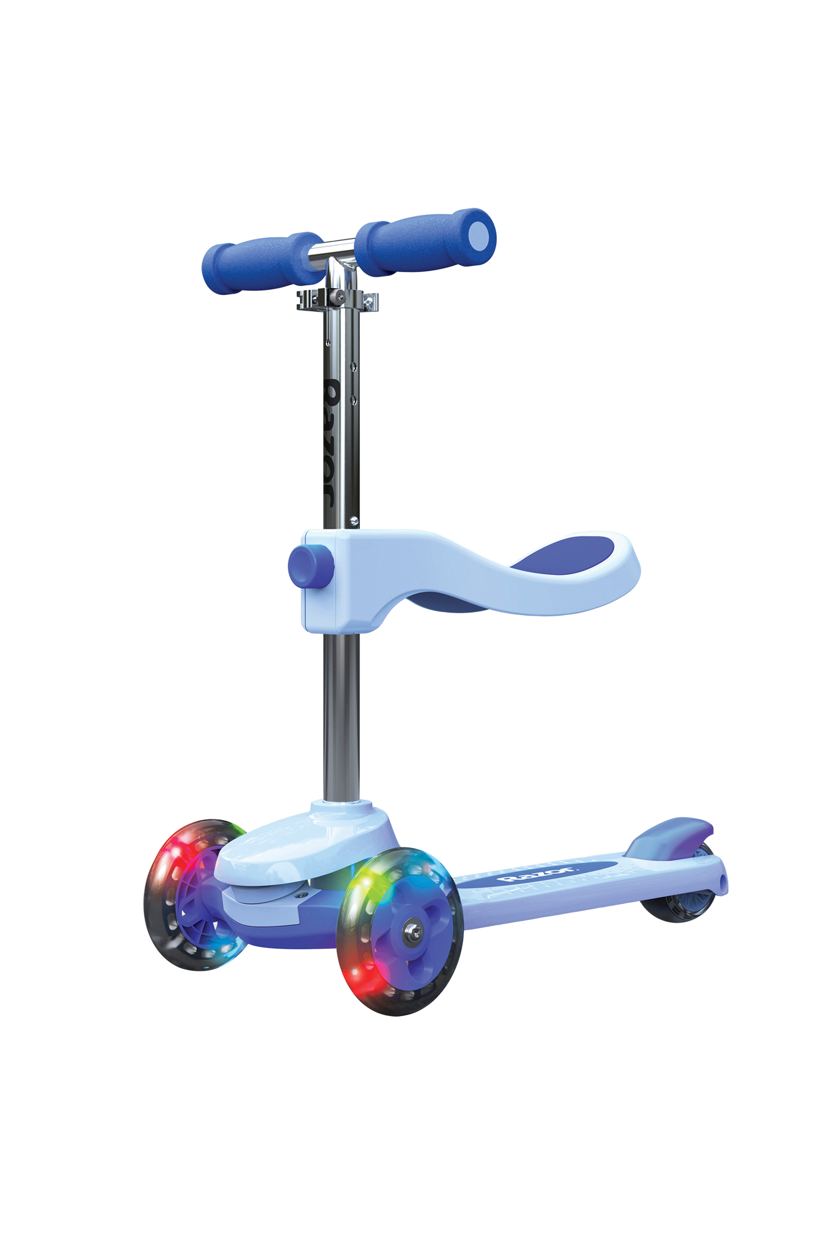 Razor Rollie er en trehjulet scooter perfekt til yngre børn og førstegangskørere, der ønsker at lære at balancere og styre. Dette 2-i-1 konvertible løbehjul er nemt at vende og svært at vælte, kan køres med et sæde eller bruges som et traditionelt løbehjul ved at fjerne sædet.