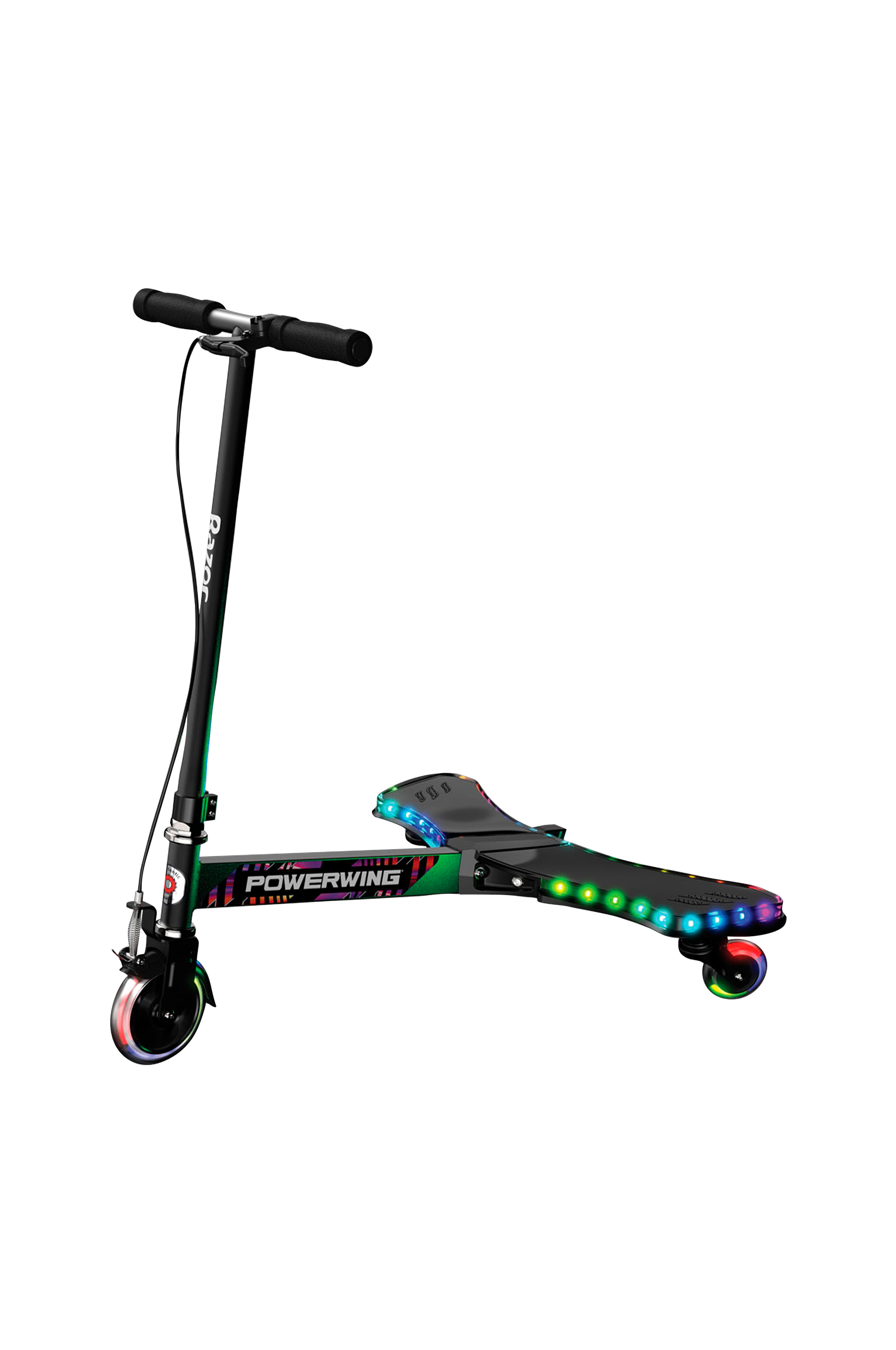 Razor PowerWing Lightshow Caster Scooter er en unik trehjulet cykel, der er designet til at gøre ethvert barns barndom uforglemmelig. Denne innovative PowerWing sættes i bevægelse ved at bevæge kroppen fra side til side, med et spændende 30 LED lysshow, der lyser i forskellige farver. LED-lysene er bevægelsesaktiverede og drives af 3 AA-batterier (medfølger). En håndbremse sikrer nem og sikker standsning, og bløde, behagelige greb giver en problemfri tur. Løbehjulet er egnet til brugere fra 6 år og opefter og kan bære en vægt på op til 65 kg. Dette kvalitetsbyggede løbehjul har en svejset stålgaffel/håndtag, en gennemsigtig vingeplatform med lysdioder, for- og baghjul i urethan med indbyggede lysdioder. Husk altid at tage sikkerhedsudstyr på, før du begiver dig ud på vejen. Bemærk: kræver en vis samling. Løbehjulets dimensioner: 71,8 cm x 70,6 cm x 79,4 cm. Produktvægt: 4,9 kg.