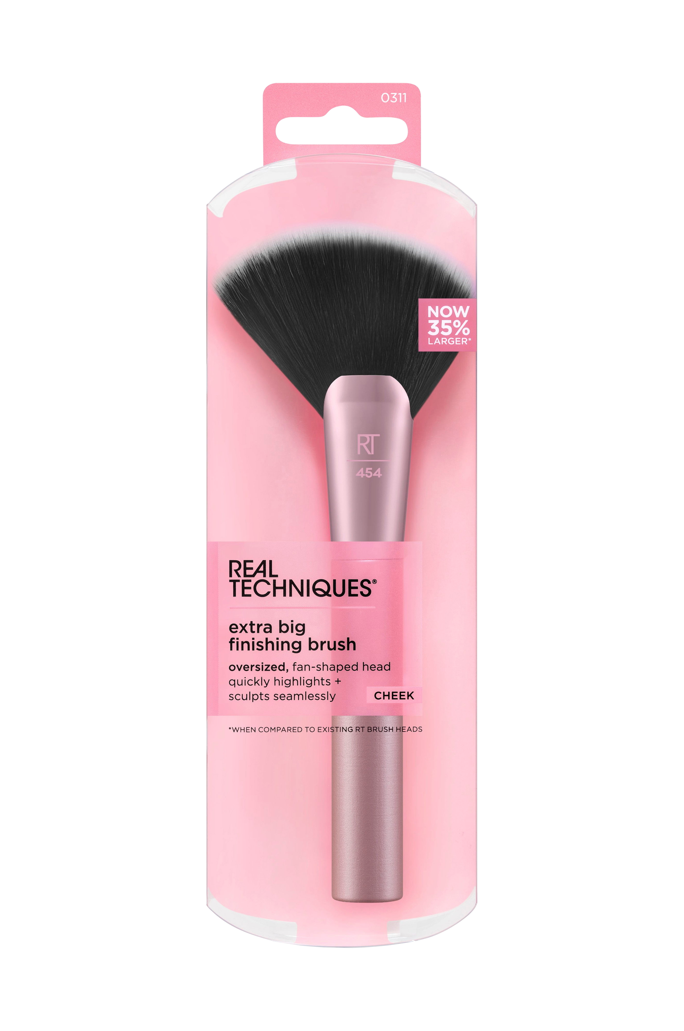 Real Techniques Extra Big Finishing Brush har et overdimensioneret, vifteformet børstehoved, der er 35 % større end eksisterende makeupbørster fra Real Techniques. Med Extra Big Finishing Brush 454 kan du nemt definere og fremhæve dine kindben, kæbelinje og pande. Børsten kan bruges med både løse og pressede produkter, f.eks. contour, bronzer og highlighter.