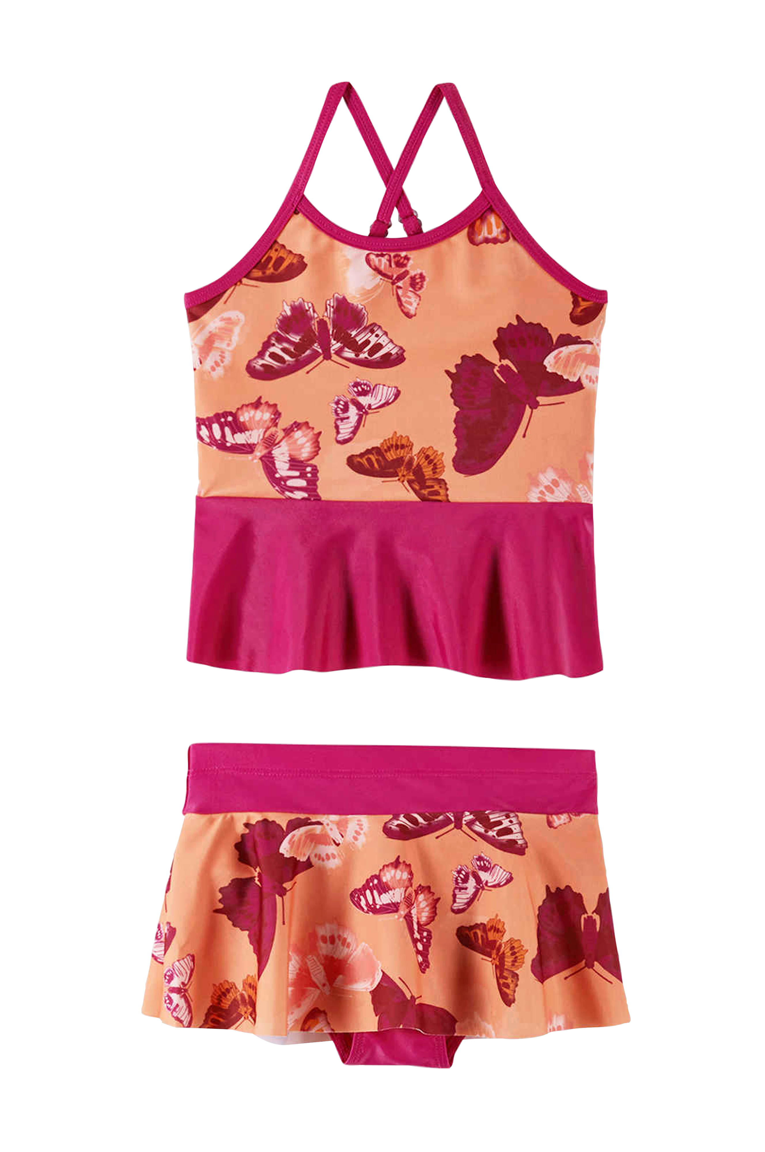 Bikini / solbeskyttelsesdrag for små børn. Det er en del af Reimas SunProof kollektion og materialet har en solbeskyttelsesfaktor på 50+. Elastisk foring foran, der giver bedre dækning i solen. Justerbare skulderstropper. Bikinitrusser med nederdel, der har en behagelig linning med elastik.