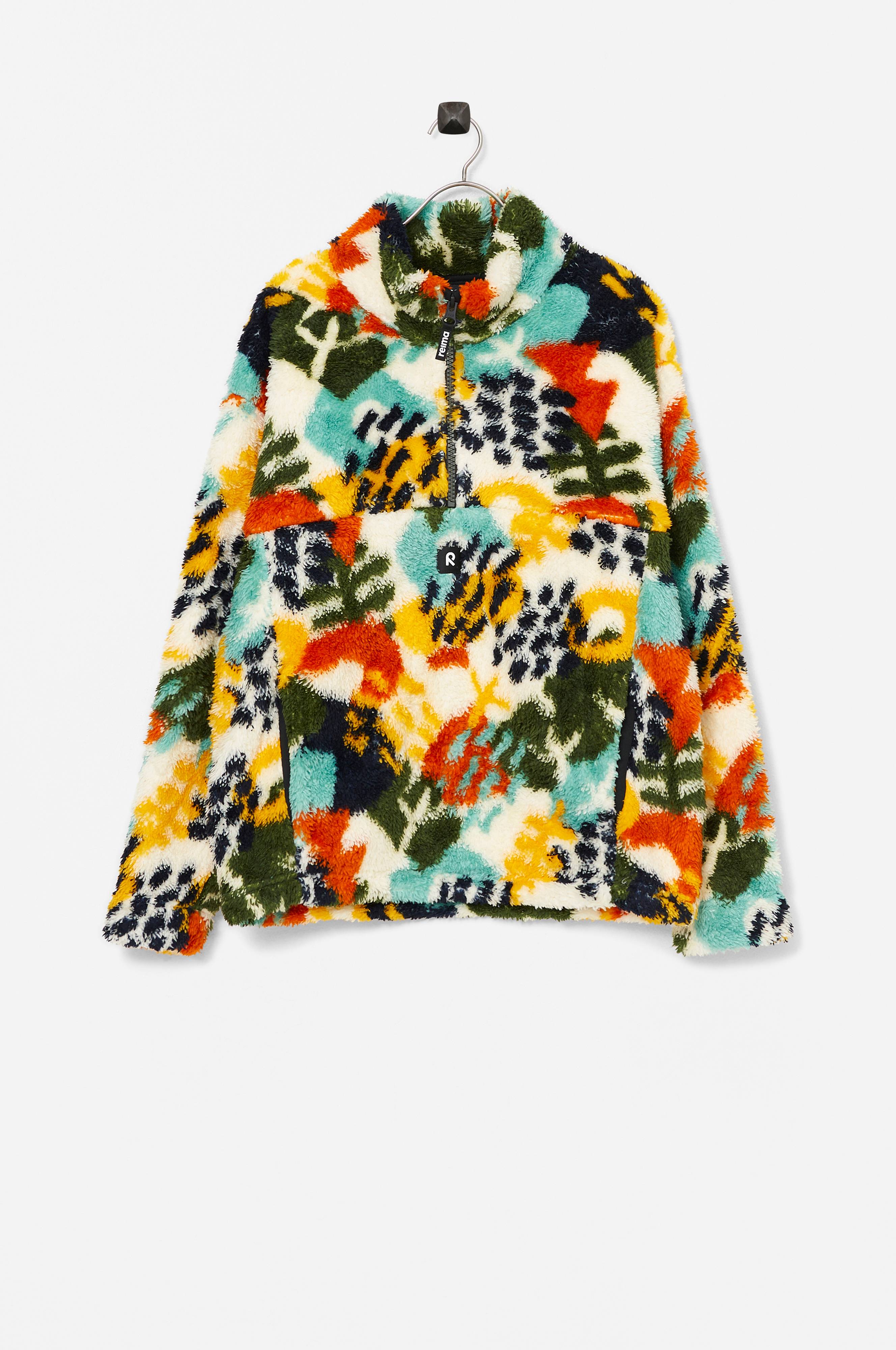 Varm og blød trøje i plys med fleece på indersiden. Trøjen er fin alene på kølige, tørre dage, men kan også bruges som varmt lag under vinterjakken. Høj krave og halvlang lynlås. Kængurulomme.