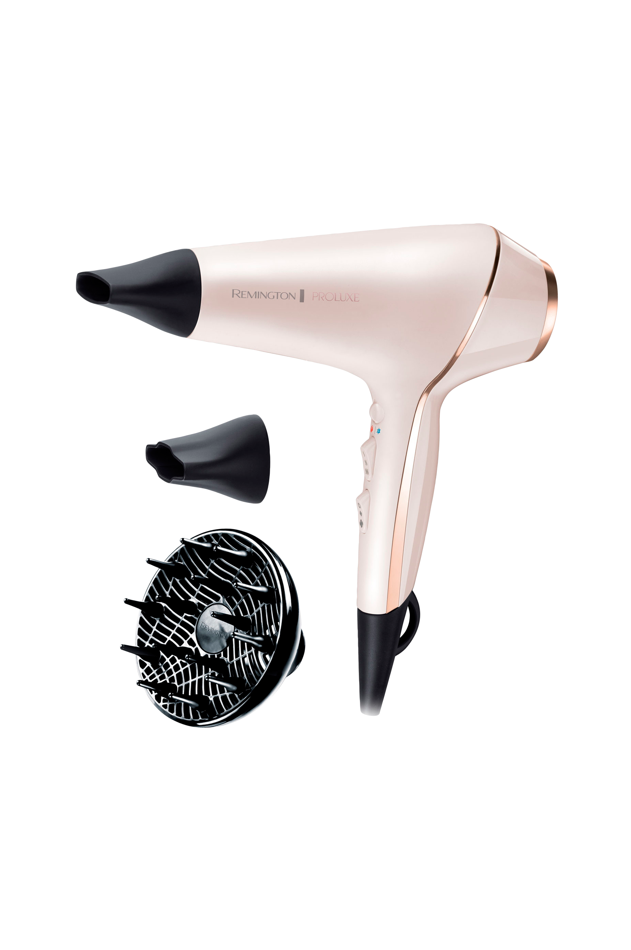 PROLuxe hårtørrer har ionfunktion som giver et resultat uden krus og med mere glans. - Kraftfuld AC-motor på 2400 W, med flere ioner der giver blankt hår uden krus - Intelligent OptiHeat-teknik giver varme når der er brug for det - Pro+ og StyleShot-indstilling - Exklusivt Remington-mundstykke for optimal varmefordeling - Forbedret luftstrøm og varmefordeling