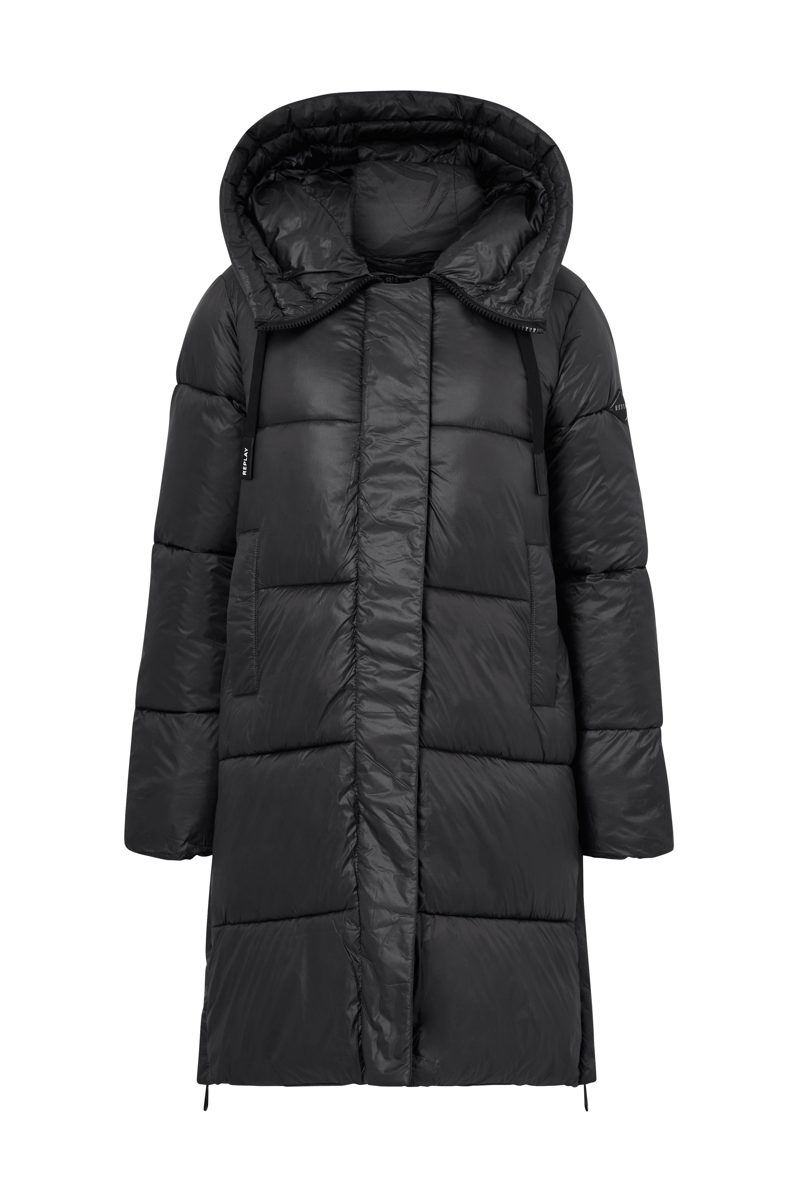 • Quiltet, foret jakke• Lang model• Fast hætte med træksnørre• To-vejs lynlås• Vindflap med trykknapper• To lommer med trykknap• To inderlommer• Lynlåse nede i siderne• Længde: 93 cm i størrelse S