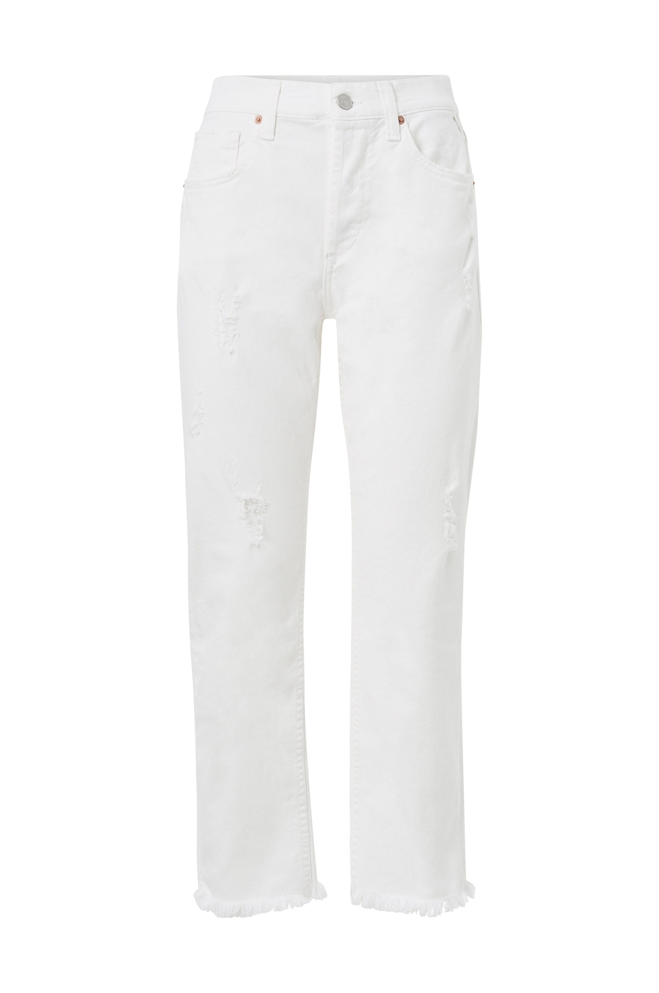 Hvide jeans med slidte effekter og afklippet, frynset benkant. 5-lommemodel med knapgylp. Lige model.