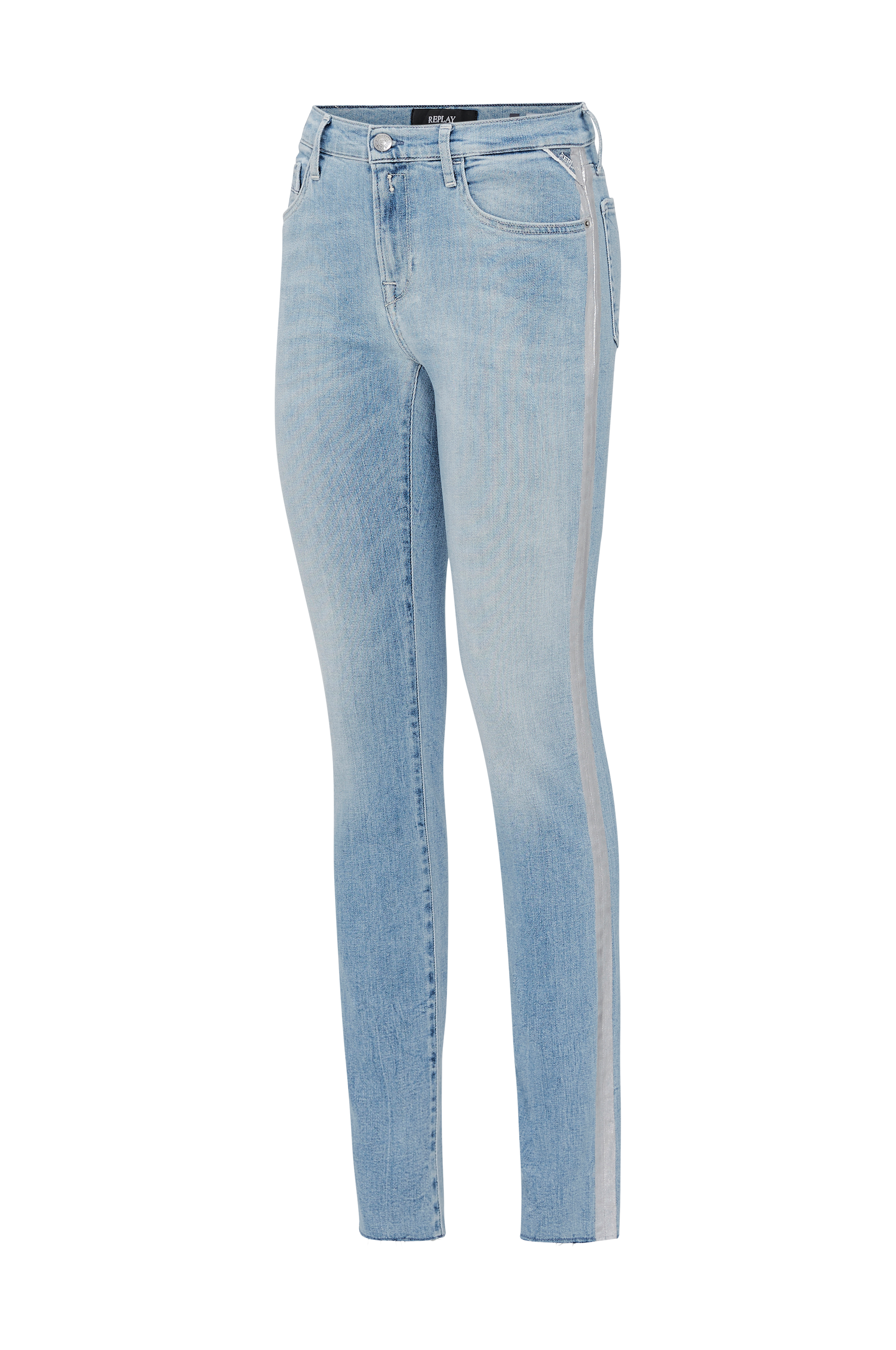 Jeans Vivy fra Replay i stretchdenim med printede, sølvfarvede striber langs benene. 5-lommemodel med smal pasform. Knap og gylp med lynlås. Usømmede kanter i benkanten. Fodvidde ca. 28 cm.Matchende tørklæde medfølger.