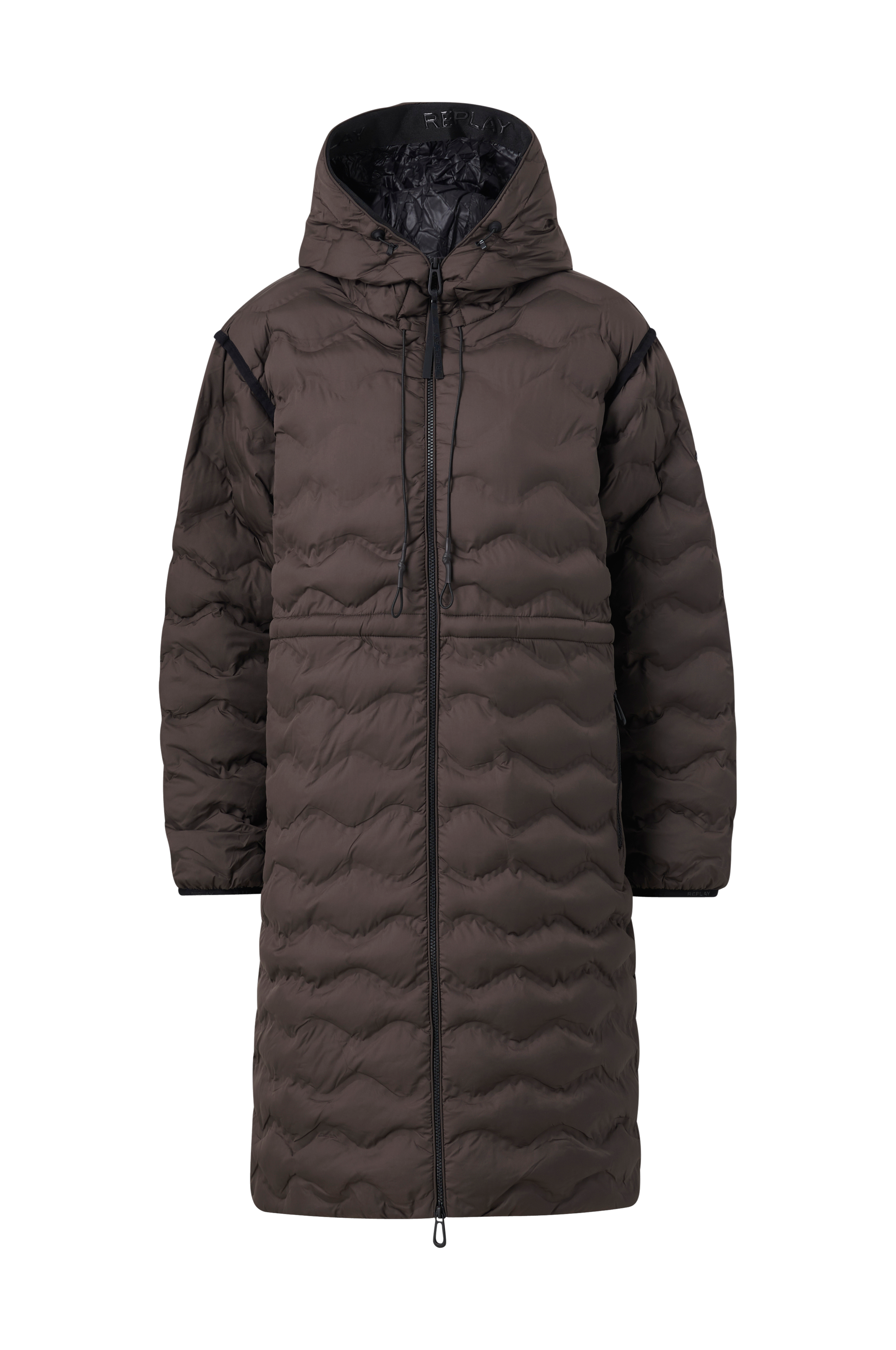 • Quiltet, foret jakke• Lang model• Fast hætte med træksnørre• To-vejs lynlås• To lynlåslommer• En inderlomme med lynlås• Indvendig træksnørre ved taljen• Elastiske kanter ved manchetterne• Længde: 105 cm i størrelse S
