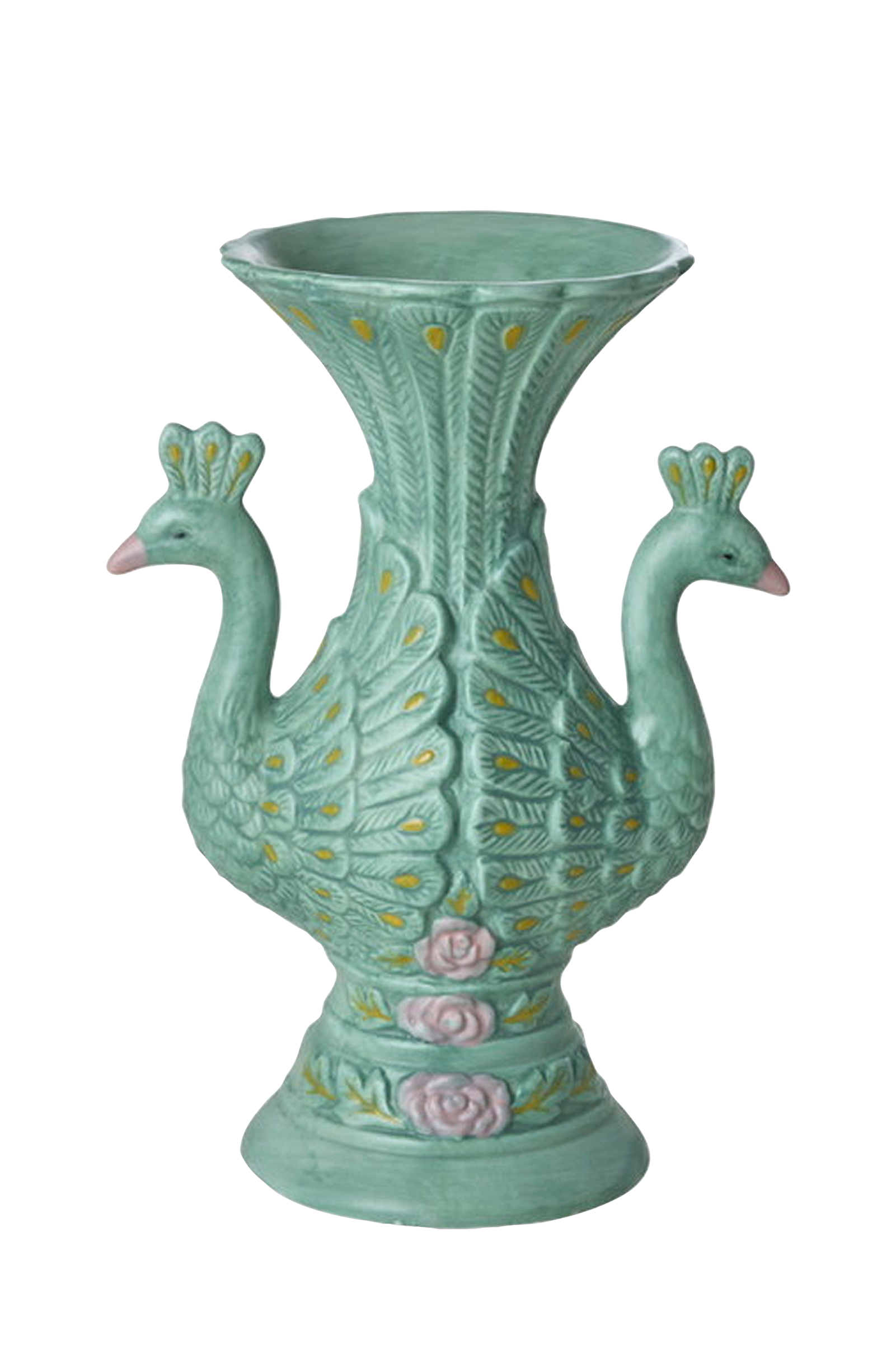 Skøn og finurlig keramikvase med to påfugle omgivet af deres smukke fjer. Formen er helt unik, og alle de smukke detaljer er håndmalede. Brug den i køkkenet, stuen eller entréen for et strejf af hverdagsmagi!