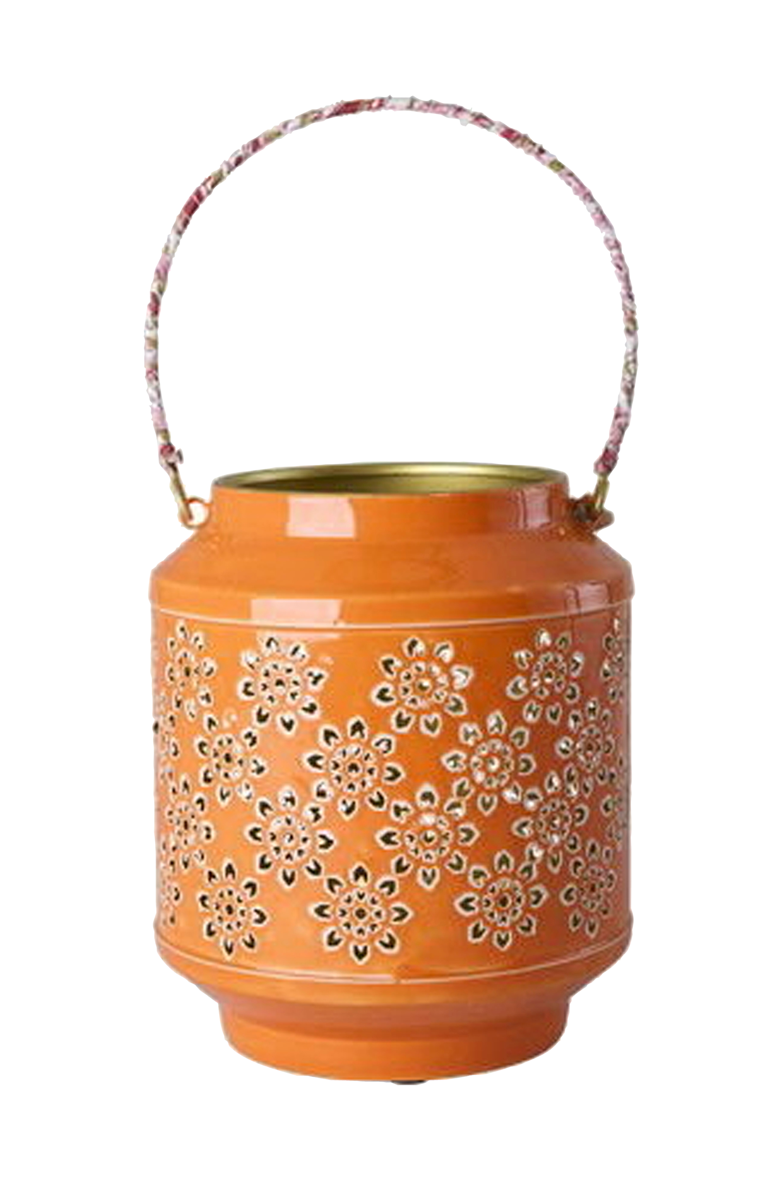 Lys op i dit rum med den sødeste metallanterne! Den har et smukt blomsterdesign og en malet inderside, der skaber en varm, magisk glød, når den er tændt. Farven og det stofbeklædte håndtag gør den til den perfekte tilføjelse til hyggelige aftener, havefester eller bare hverdagsglæde.
