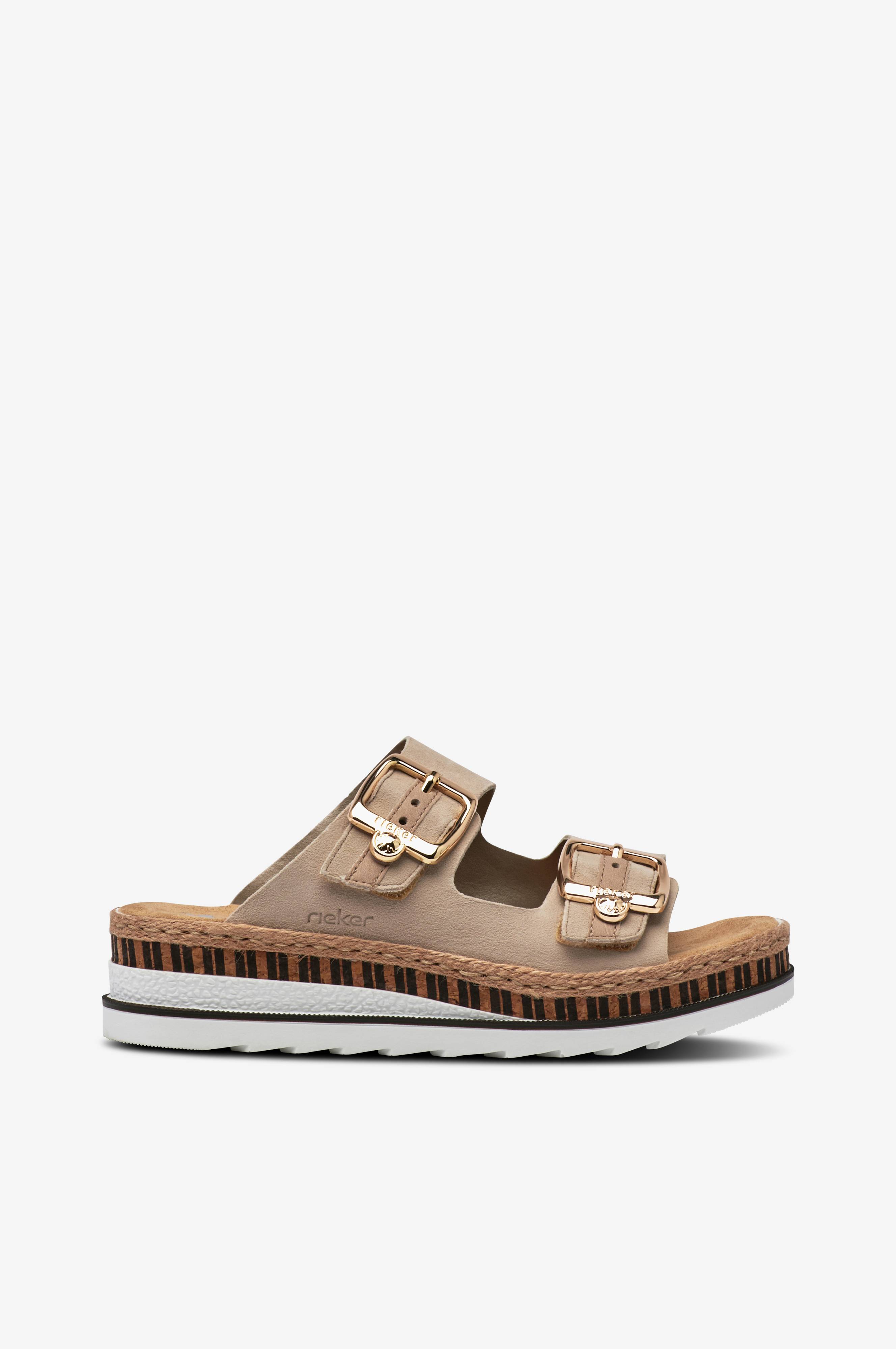 • Fremstillet af imiteret læder• Lav wedgehæl• To justérbare remme med velcrolukning• Dekorative spænder i guldfarvet metal• Rebbeklædt midtersål• Hælhøjde: 4,5 cm• Blødt polstret, stødabsorberende Antistress-indlægssål
