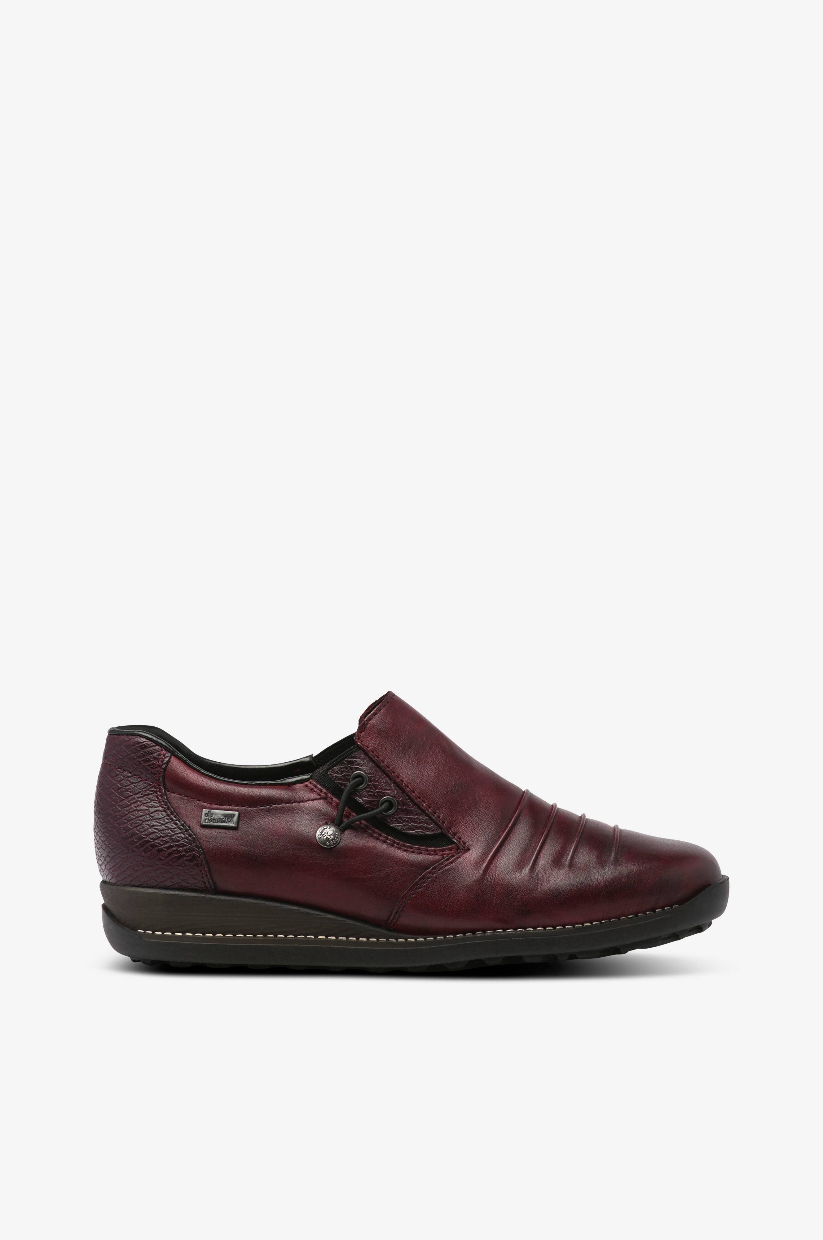 Sko fra Rieker i slip on-model. Af blødt, smidigt skind med blanke, mønstrede detaljer. Indsatte elastikkiler på begge sider om vristen. Fleksibel antistress-sål reducerer træthedsfornemmelsen i fødderne. Denne model er udstyret med Rieker-Tex, en membran som gør skoen vandafvisende. Skridsikker ydersål.