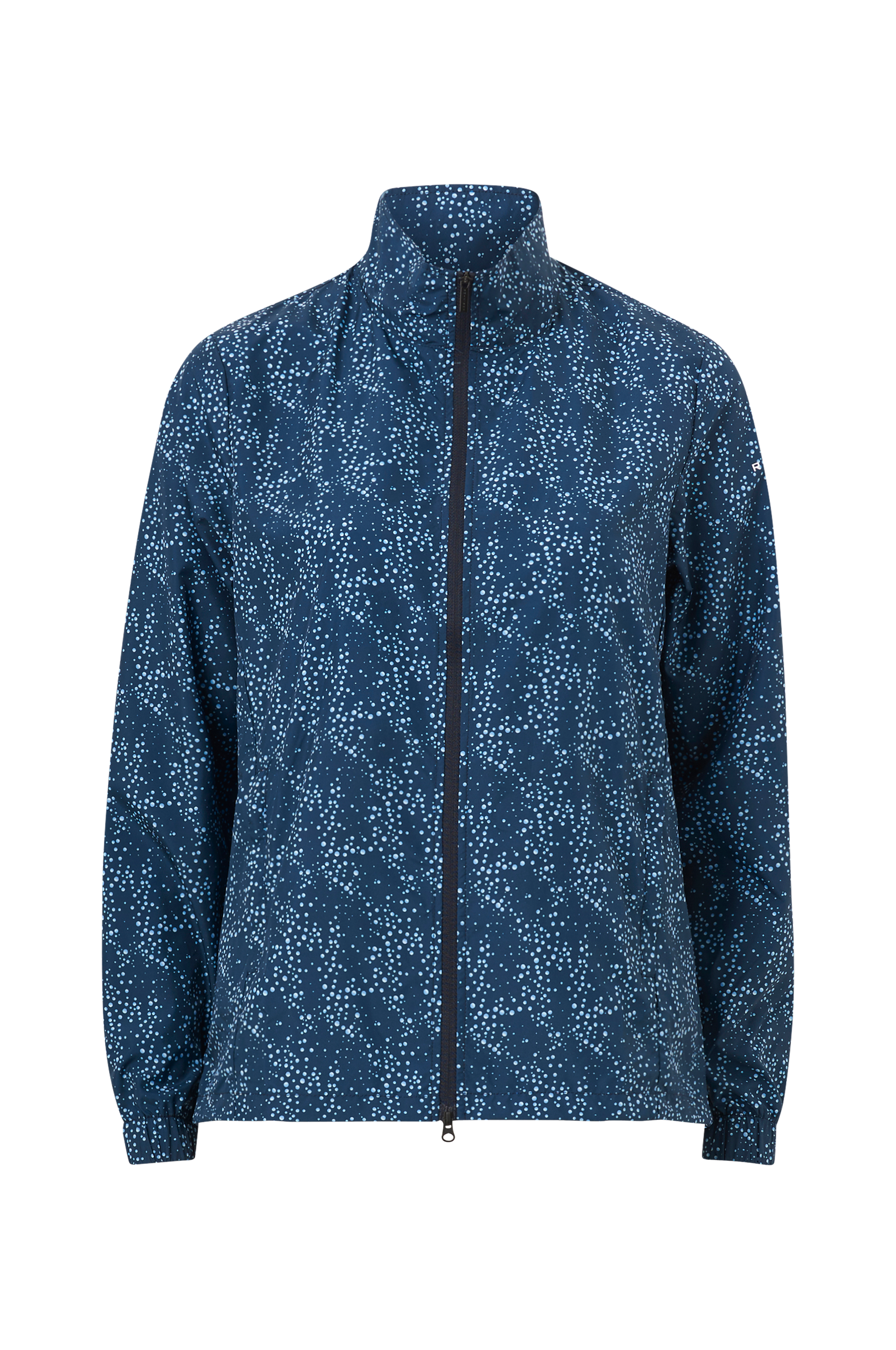 Tynd jakke i et let, vandafvisende stof af genindvundet polyester. 2-vejslynlås og to lommer med lynlås foran, standkrave samt justerbar løbegang forneden. Jakken kan pakkes ned i en af lommerne. Længde ca. 65 cm i str. S.