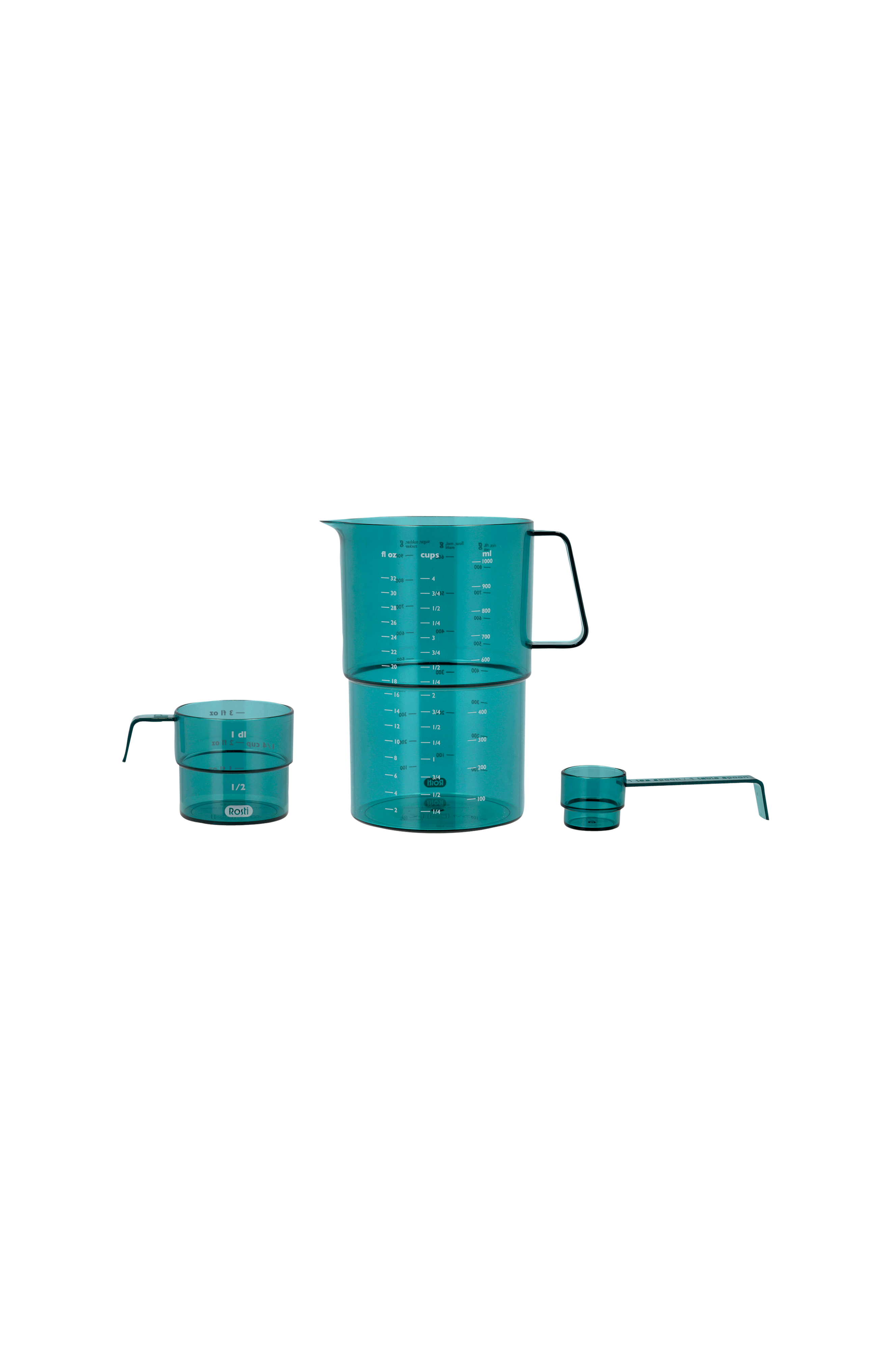 Målesæt med tre dele bestående af en målekande på 1,0 liter, et decilitermål og en måleske af SAN, som er meget gennemsigtigt og præget af høj kvalitet og holdbarhed. Mål 14,9x10,3x15,9 cm.