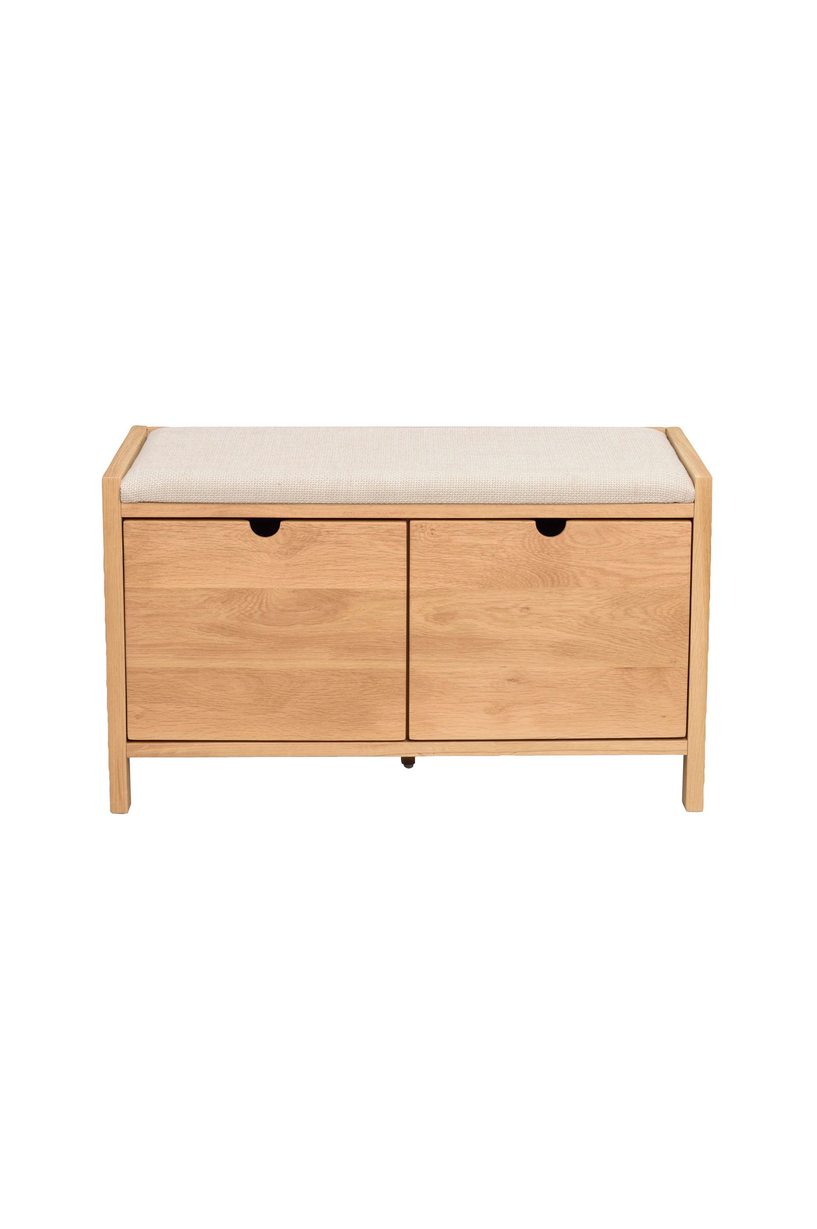 Hillmond bænk i eg med stof i en smuk beige tone skaber en indbydende og harmonisk følelse i din entré. Hold styr på dine ejendele og bevar entréens rene look ved hjælp af de to praktiske skuffer med blød lukning. Gangbænken leveres desuden færdigsamlet, så du kan få glæde af den praktiske opbevaring med det samme. Hillmond-kollektionen er synonym med høj kvalitet, smukke trædetaljer og harmonisk skandinavisk design. Kombinér gerne bænken med andre møbler fra hillmond-kollektionen for en harmonisk stil.