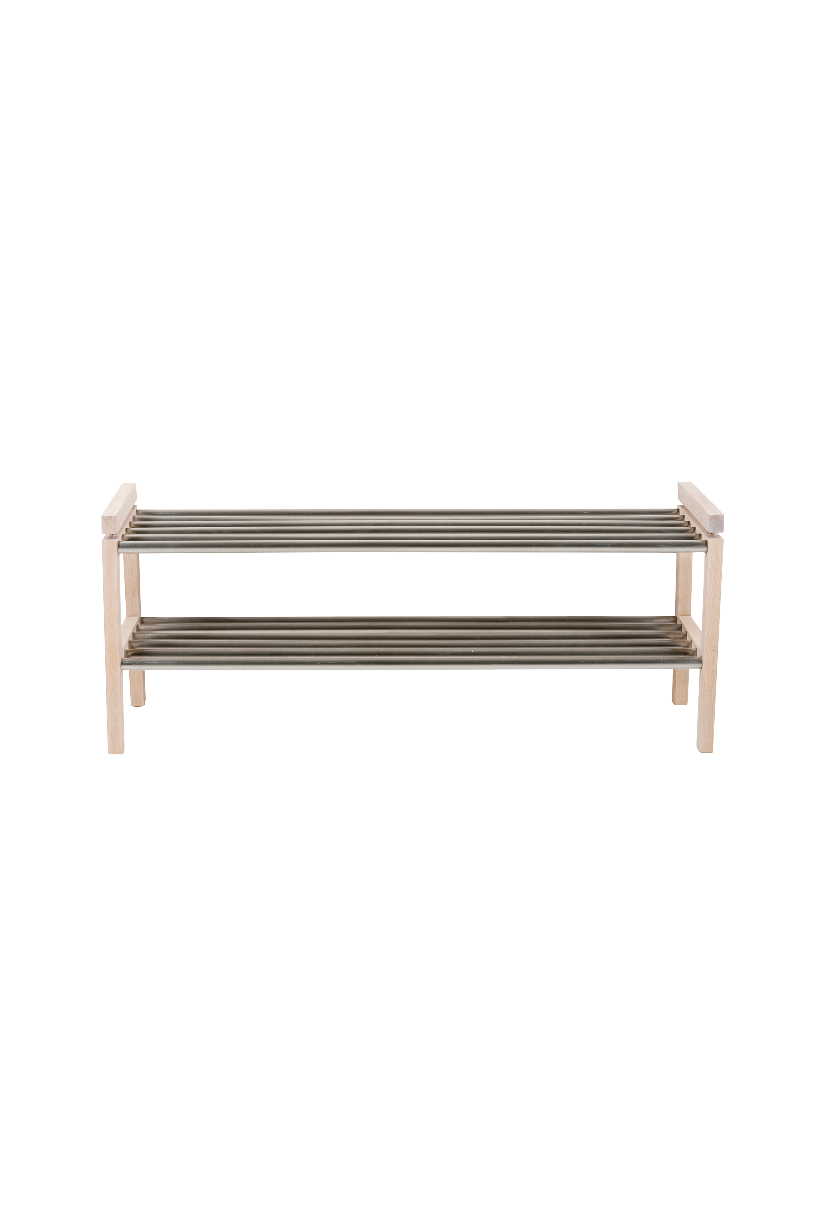 Confetti skoreol. Dekorative ribber i metal. Bredde 100 cm, højde 40 cm, dybde 30 cm. Stilren og let at placere. Skoreolen er en del af vores entréserie Confetti.