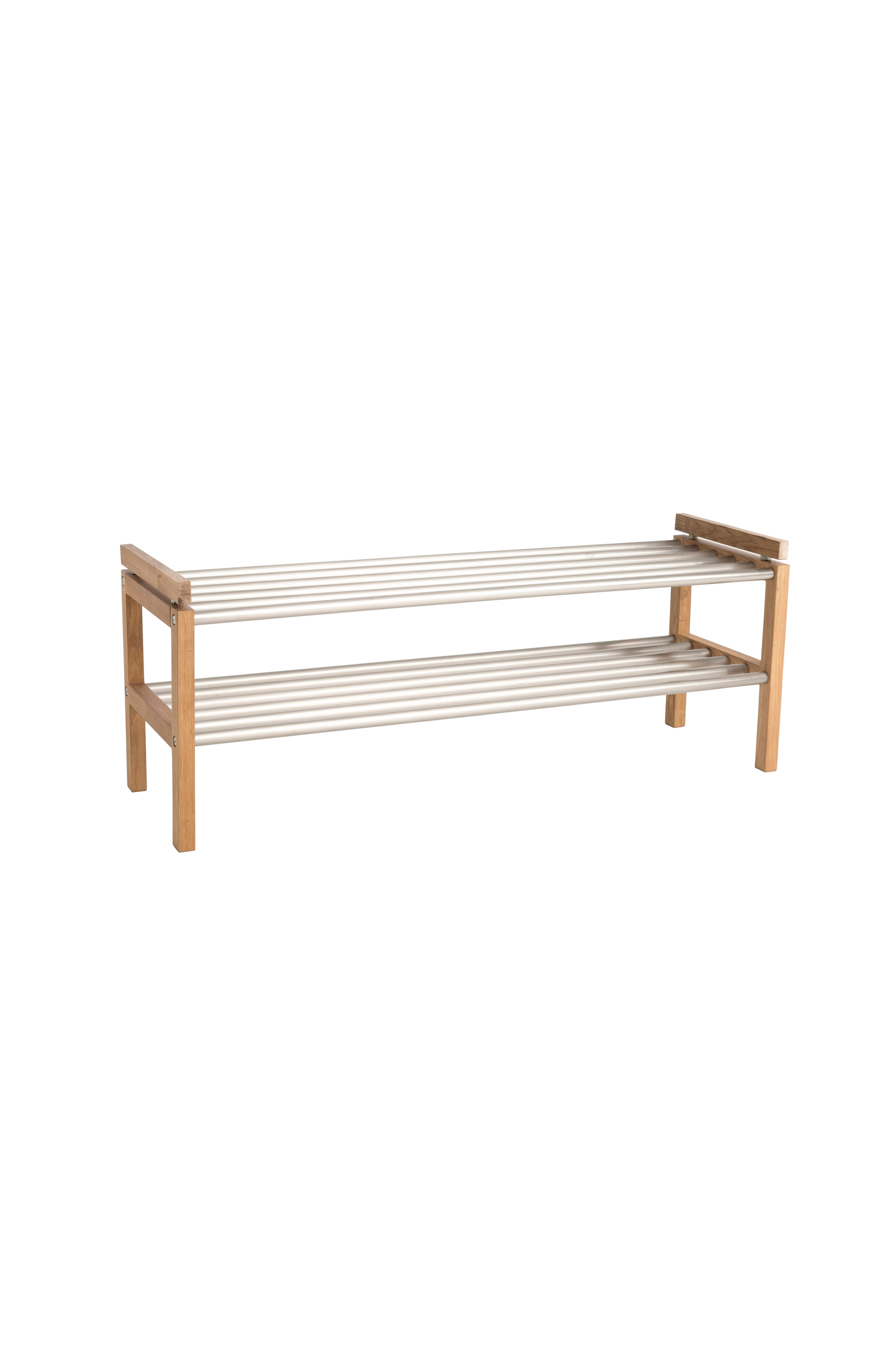 Confetti skoreol. Dekorative ribber i metal. Bredde 100 cm, højde 40 cm, dybde 30 cm. Stilren og let at placere. Skoreolen er en del af vores entréserie Confetti.