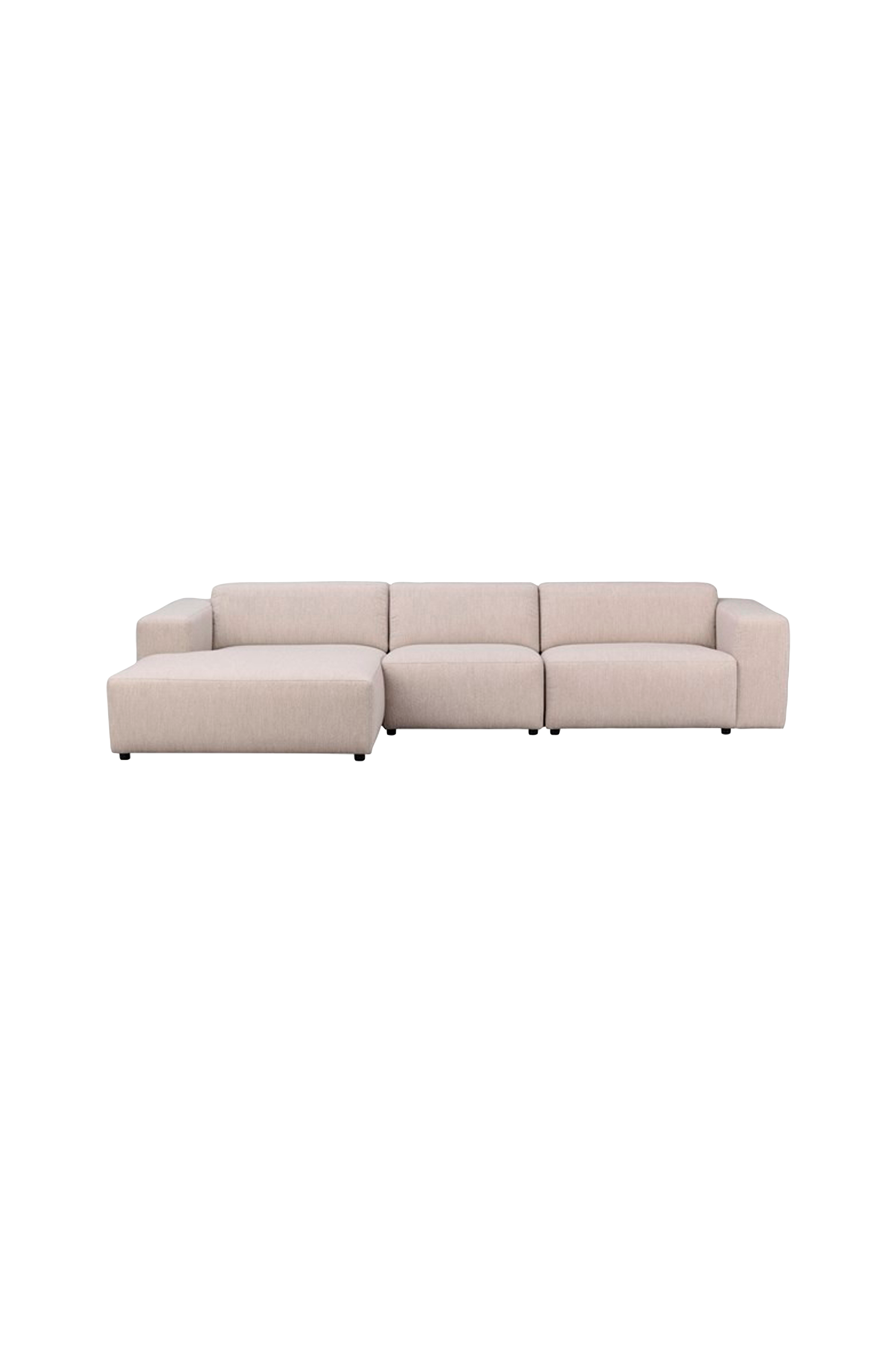 Willard 4-personers sofa med chaiselong til venstre er en minimalistisk og moderne loungesofa med plads til mange - her betrukket med det smukke boucléstof Alice i en lys beige tone. Designet er blødt og rundt, hvilket giver en varm og indbydende følelse. Den store chaiselong giver dig ekstra siddepladser, perfekt til dem, der ønsker at samle familie og venner i stuen.