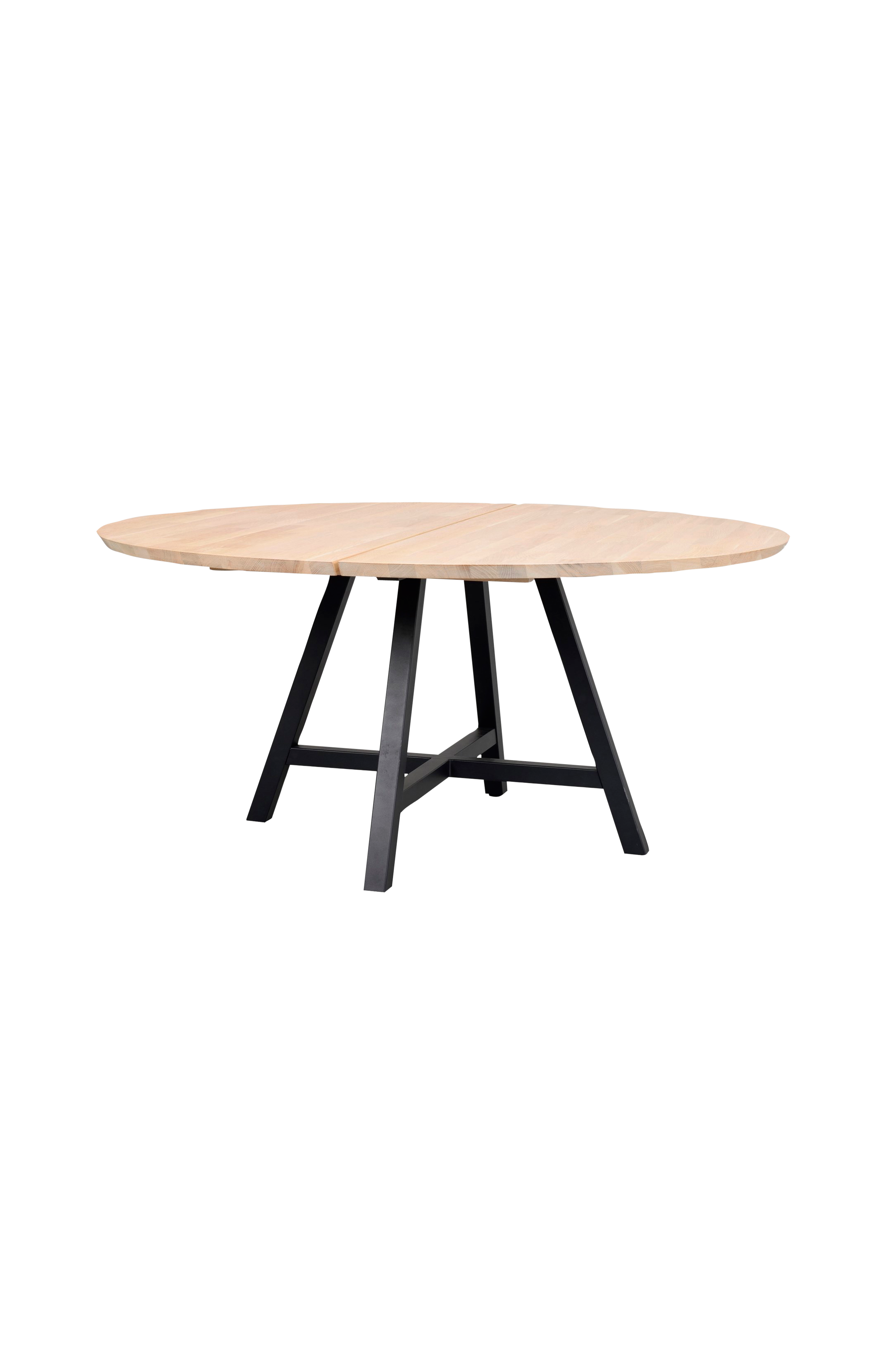 Carradale spisebord med todelt massiv bordplade i massiv eg og A-ben i sort pulverlakeret metal.