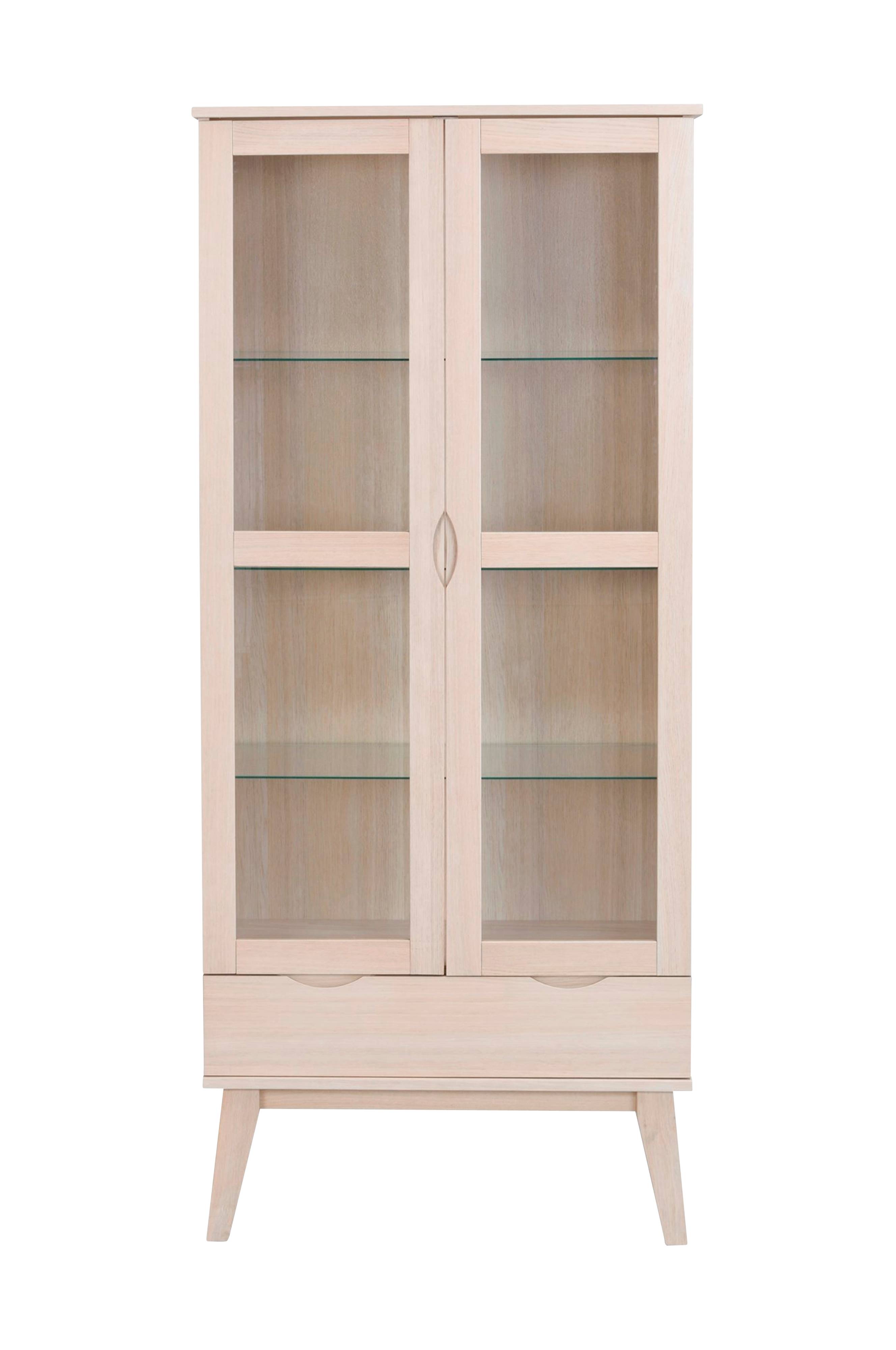 Klassisk vitrineskab i lakeret hvidpigmenteret eg med glaslåger samt en skuffe. Soft close-skuffe og låger samt hyldeflade i hærdet glas. Bredde 82 cm, højde 185 cm, dybde 40 cm. Leveres samlet.
