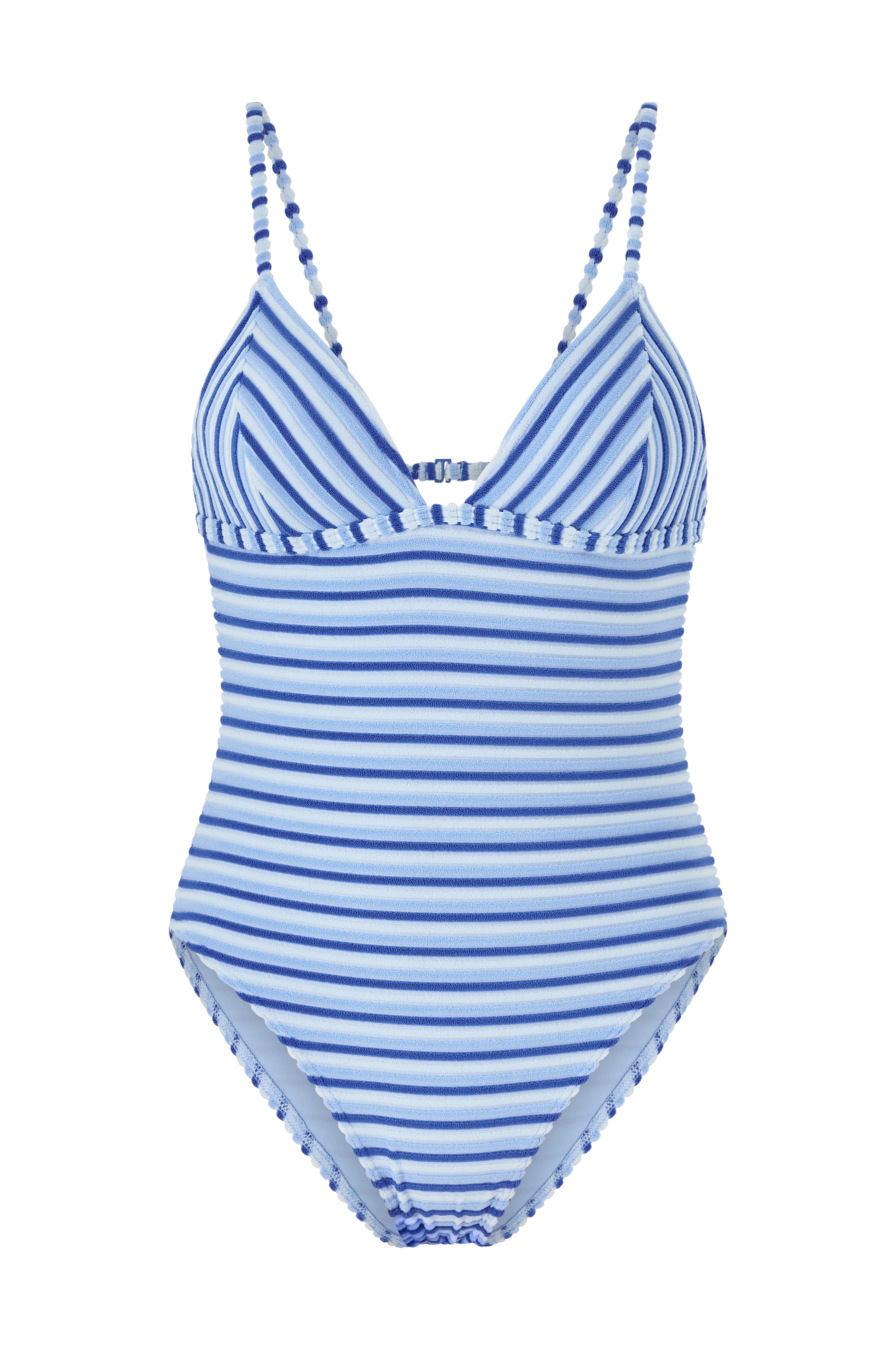• Helt foret badedragt i polyester med struktur og stribede mønstre• Tynd, justérbar skulderstrop• Trekantede skåle med aftagelig polstring• Åben ryg med smalt bånd og spænde