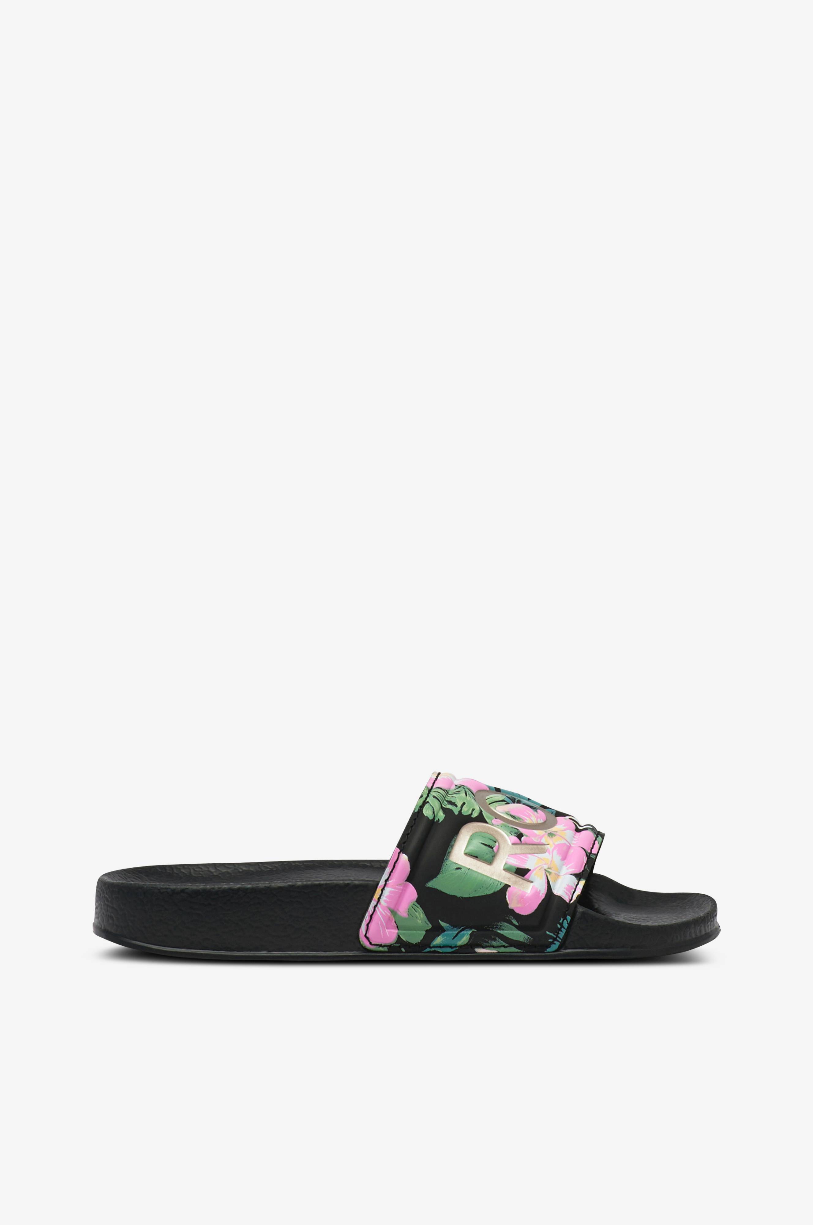 Badesandaler RG Slippy II fra Roxy med formet fodseng og bred, let vatteret rem med sølvfarvet logo over foden.