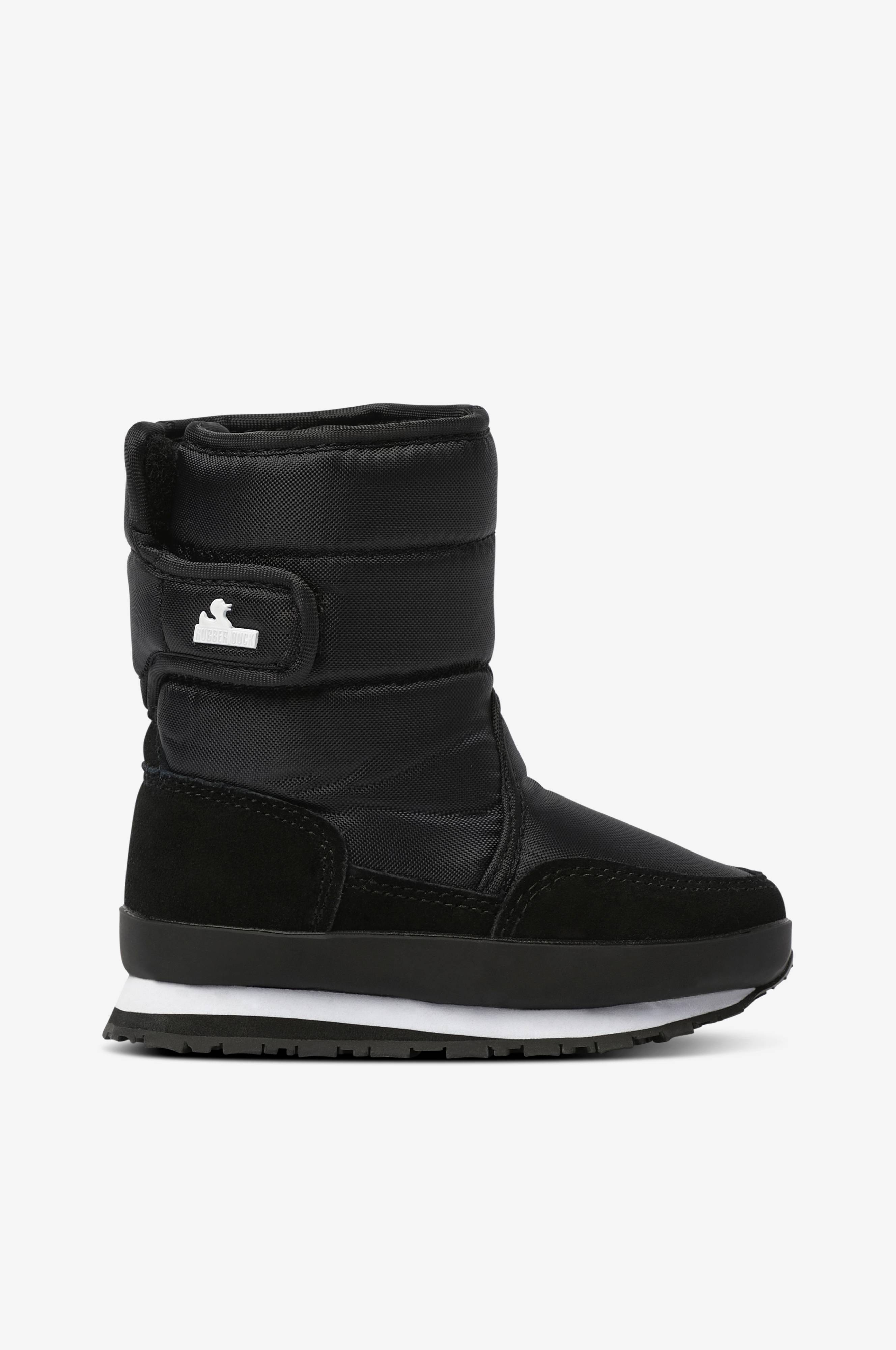 Lette, varmforede og vandafvisende vinterstøvler i ruskind og genindvundet nylon med gummiforstærkning omkring sålen. Lukkes med velcrorem. For i blød imiteret pels. Ydersål i gummi.