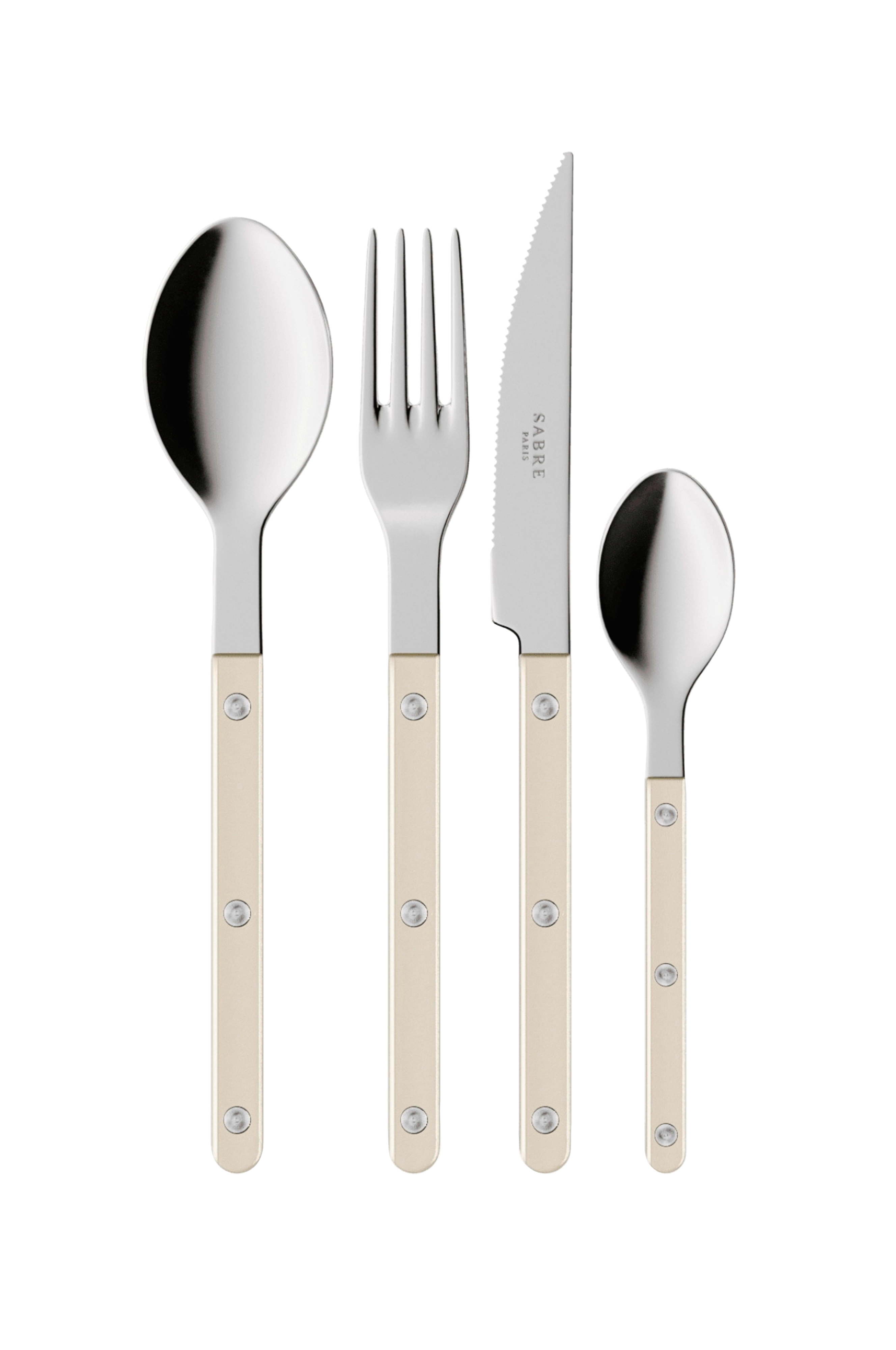 Sabre 4-delt sæt består af en middagsgaffel, en middagskniv, en teske og en dessertske. Dette sæt med 4 dele er den perfekte kombination til dine daglige måltider. Fås også som en del af et husholdningsbestik med 24 dele.