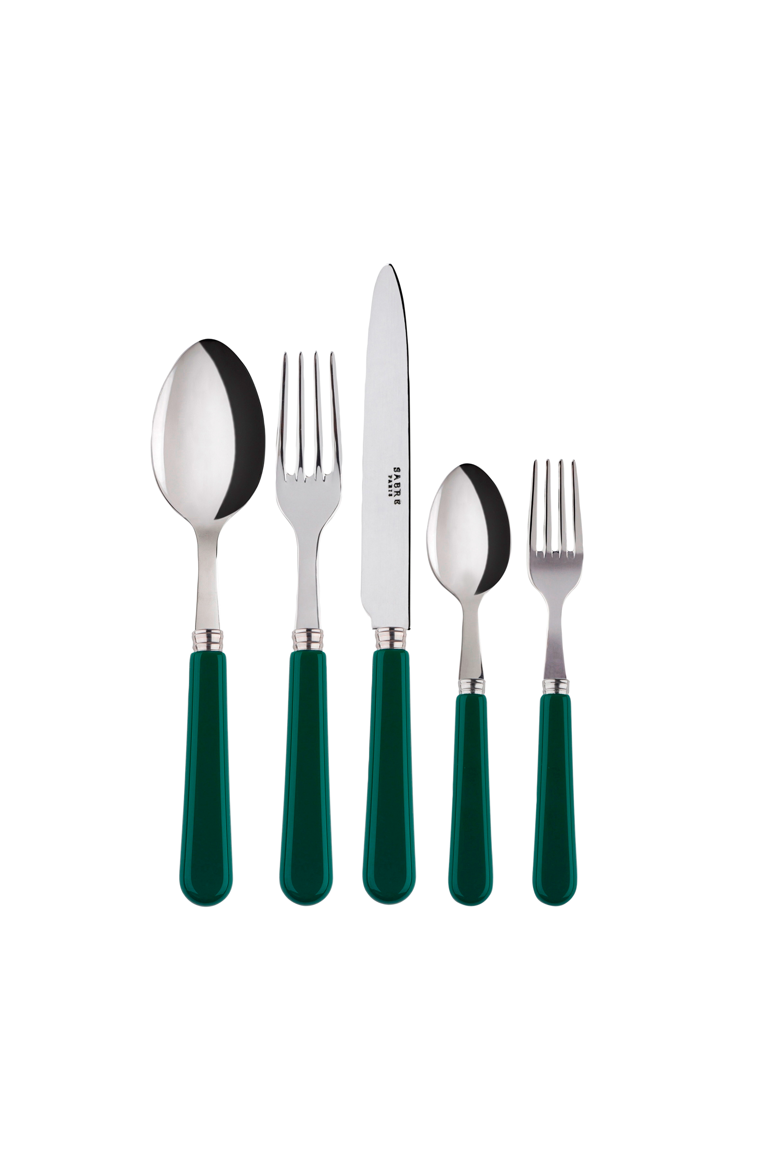 sabre-sættet med 5 dele er det grundlæggende sæt til at skabe din samling af service. det består af en suppeske, en middagsgaffel, et savtakket knivblad til middag, en teske og en lille gaffel.