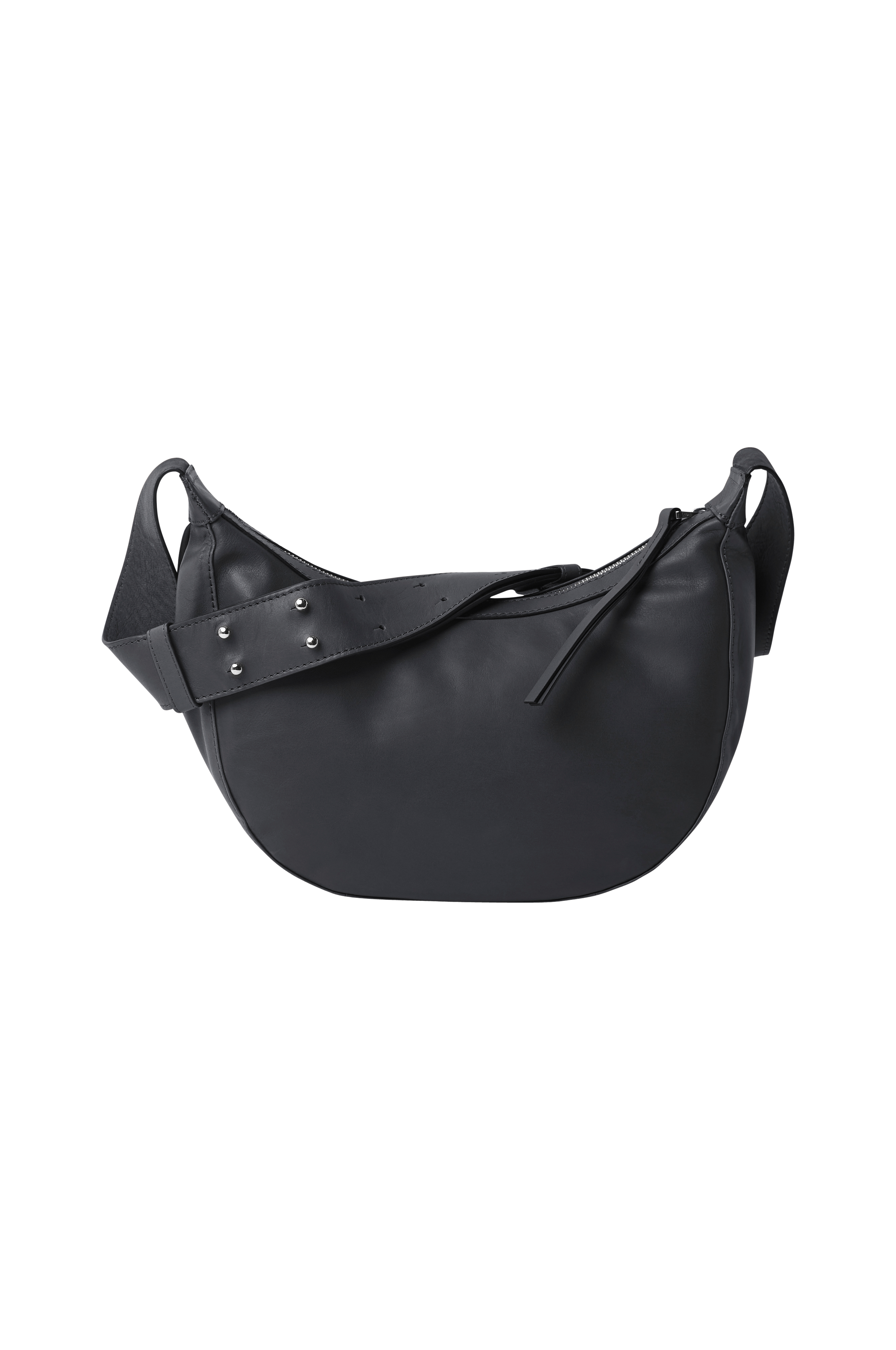 En alsidig taske i en elegant halvmåneform fremstillet af smukt sort fuldnarvet læder. Tasken har et stort hovedrum, der lukkes med en metallynlås. Indvendigt er der to åbne lommer og en lynlåslomme. Tasken har en praktisk, justerbar skulderrem med dobbelte metalnitter, som både er funktionelle og giver designet karakter. Skulderremmens inderside er lavet af blødt gedeskind. Tasken er perfekt til hverdagsbrug og vil være en god tilføjelse til din garderobe. Den justerbare skulderrem måler maks. 97 cm og min. 78 cm. Spændet er lavet af skinnende sølvfarvet metal.