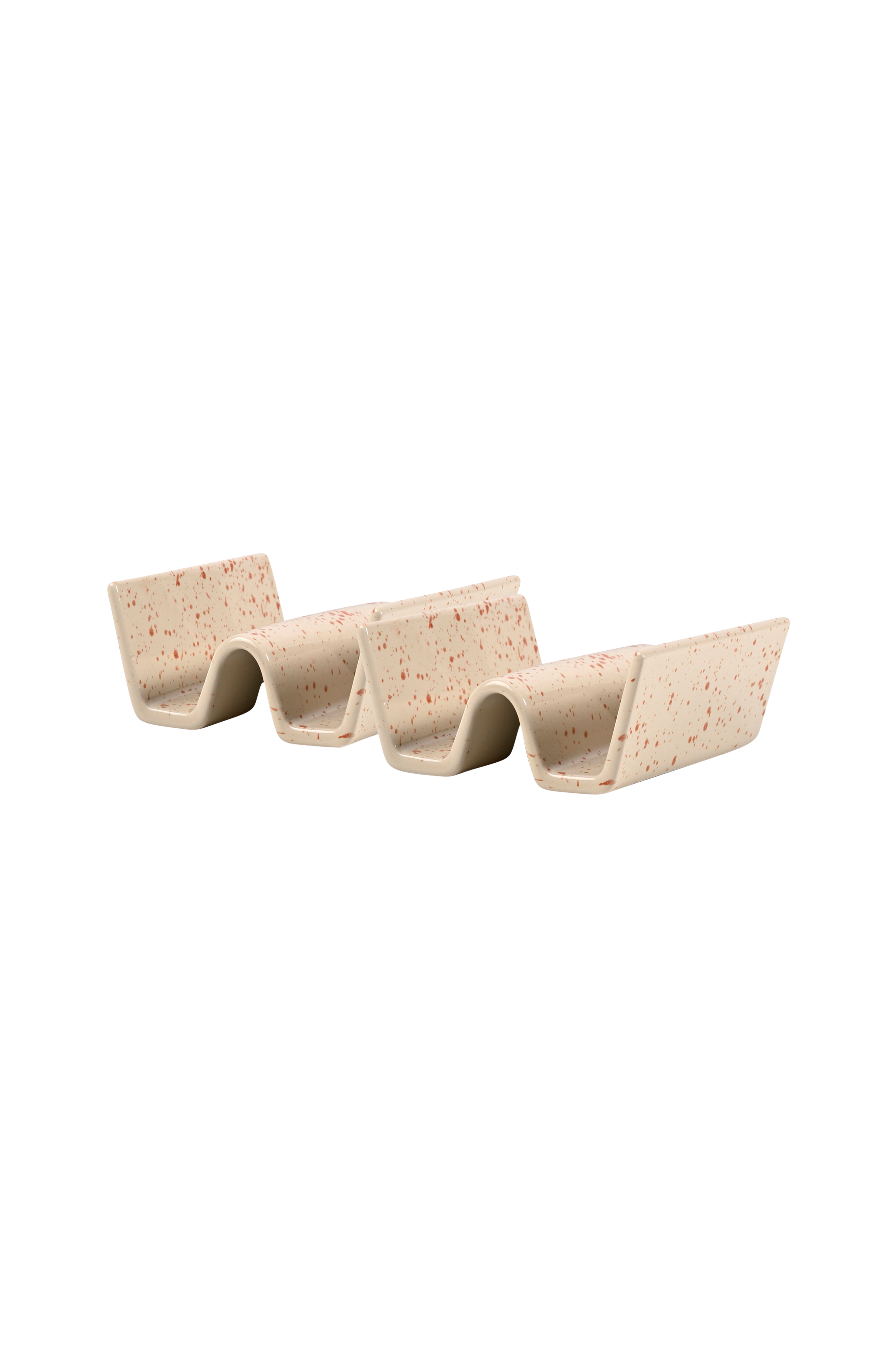 En tacosamling ville ikke være komplet uden et ordentligt stativ til tacoskaller - og her er det! Den fungerer også lige så godt til servering af bløde boller, wraps eller hotdogs. Farvepaletten er beige med et fint bordeauxfarvet stænkmønster. Stativet kan stables. Sælges i en 2-pak. Ditte er håndlavet, så hvert stykke er unikt. Fremstillet af stentøj. Design Studio Sagaform. Præsenteret i en klassisk gaveæske. Tåler opvaskemaskine og fødevarer.
