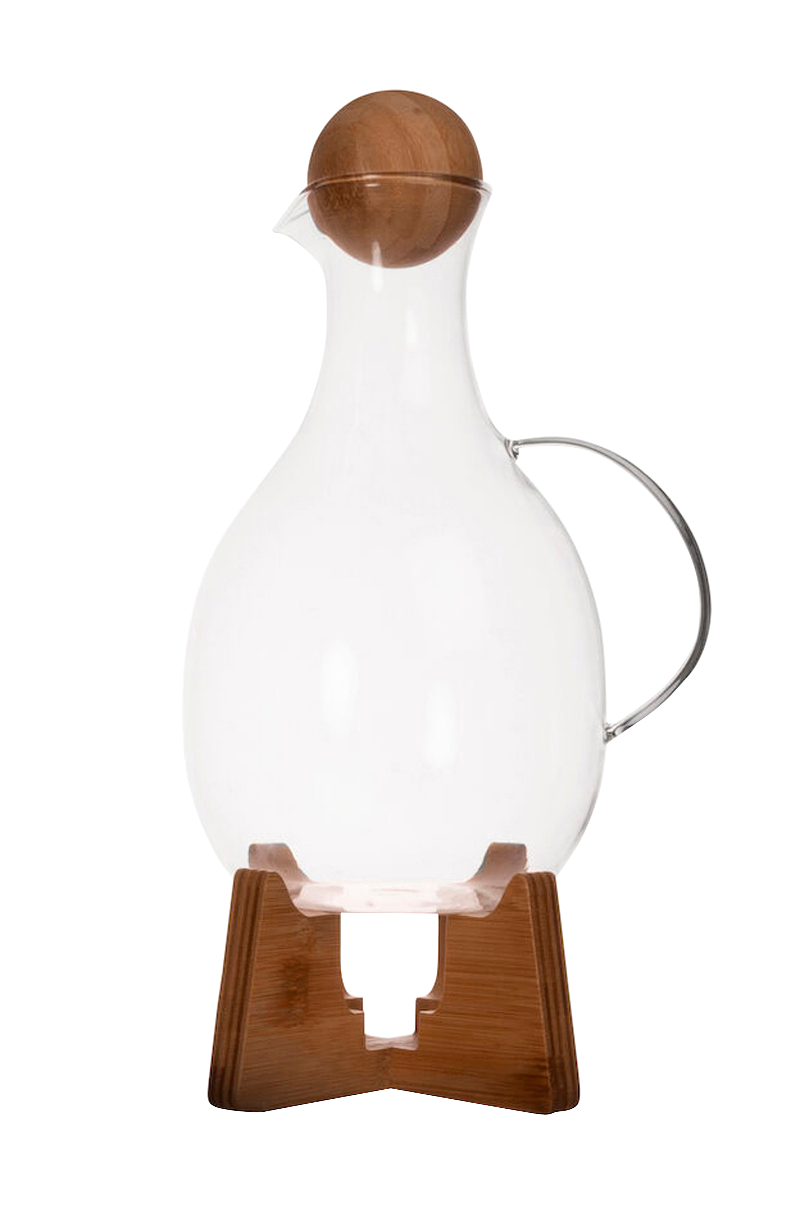 Gløggkande med varmer, som også kan bruges som serveringskande til kaffen, når julen er slut. Her møder glas bambus og runde former dominerer. Gløggkanden har en rund korkprop og emmer af enkelthed og stilrent design. Kanden opvarmes af et fyrfadslys på et bambusstativ. Mål: Diameter 16 cm, højde 32,5 cm. Rummer 1,8 l.