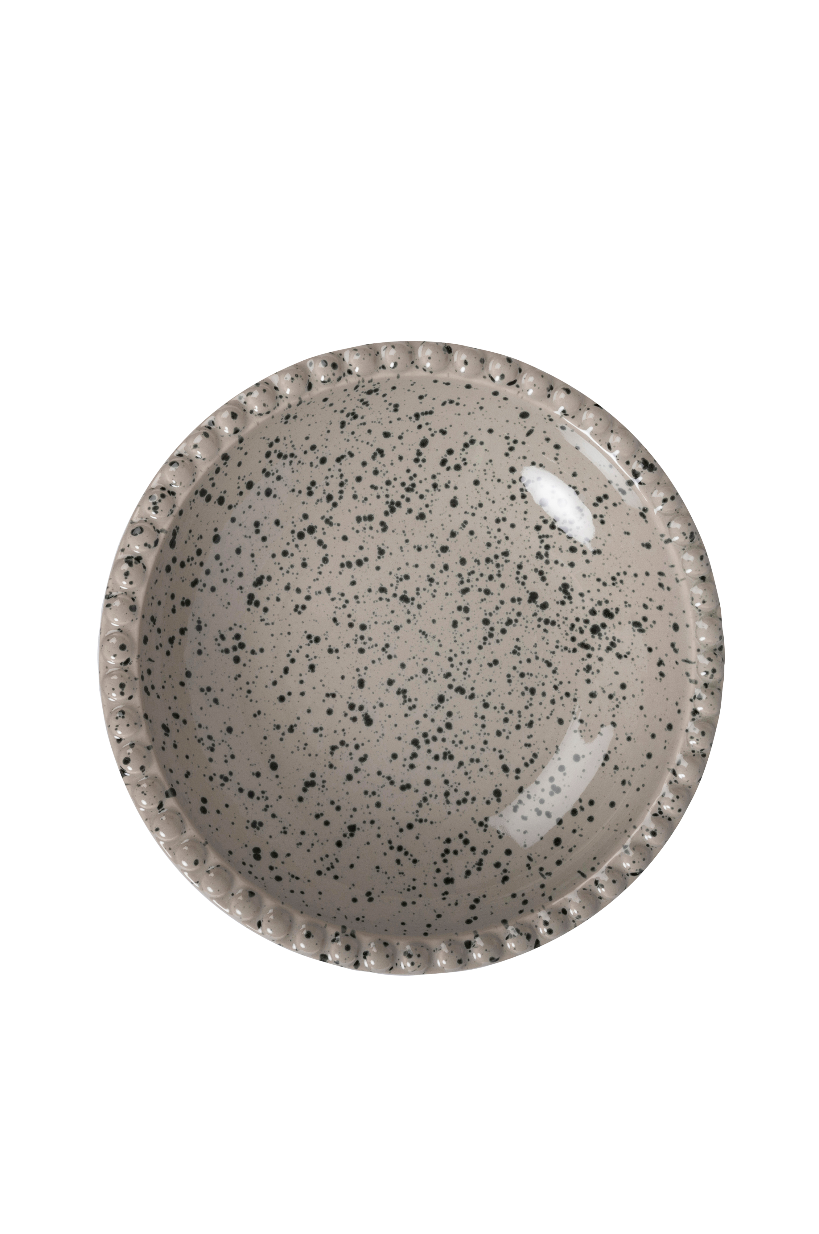 En større, håndlavet serveringsskål til salaten, brødet eller frugtsalaten. Farven er en beige/grå tone med et flot stænkmønster i sort. Fremstillet i stentøj og kan også kombineres med serien Coffee & More. Mål: Diameter 26 cm, højde 6 cm.