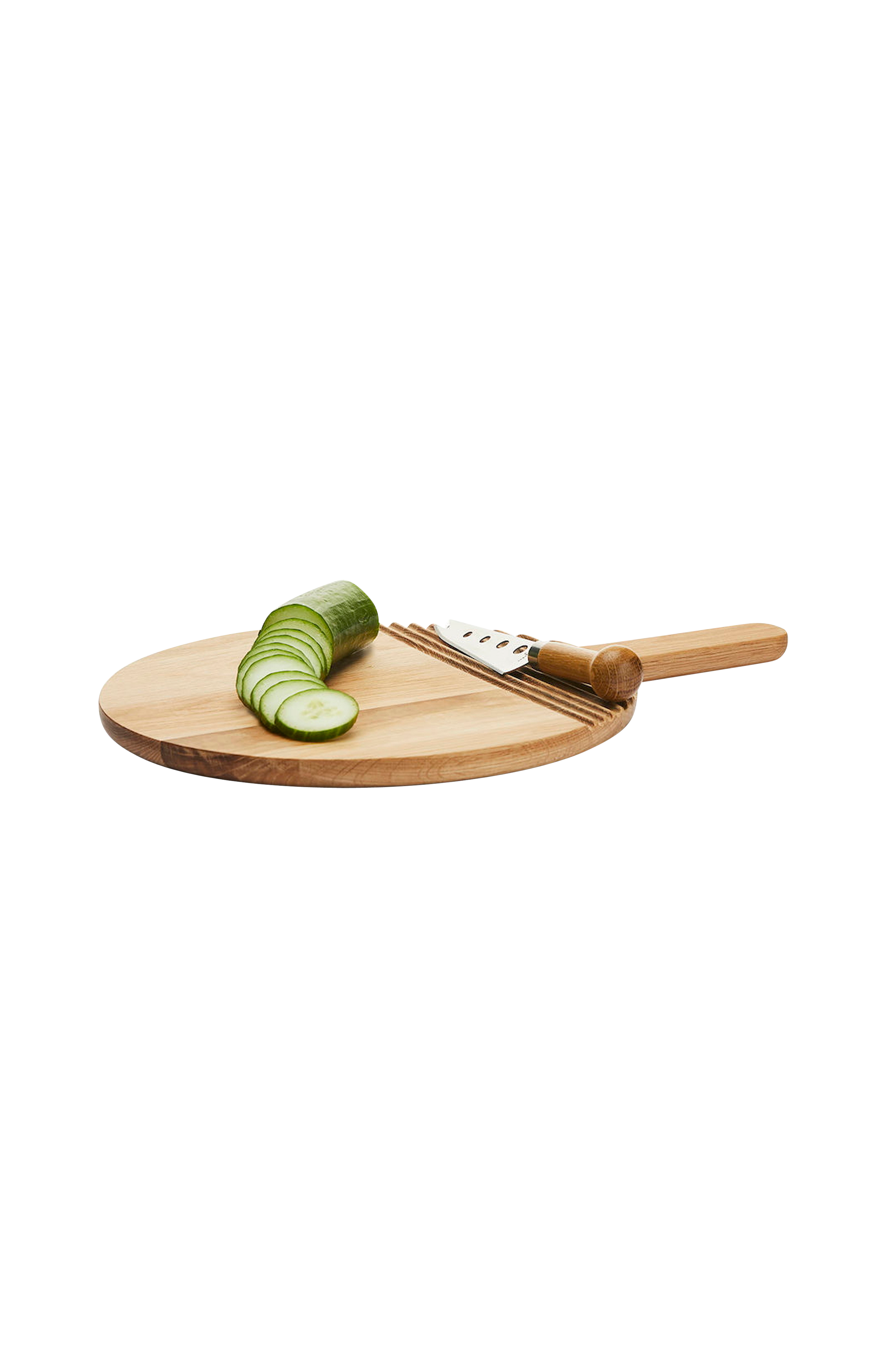 Rund skærebræt i eg med gennemtænkte detaljer. Et gedigent håndtag til servering som ligger godt i hånden. Riller som er en flot detalje og samtidigt holder redskaber på plads, så de ikke glider af for nemt. Mål: 42x30x2 cm.