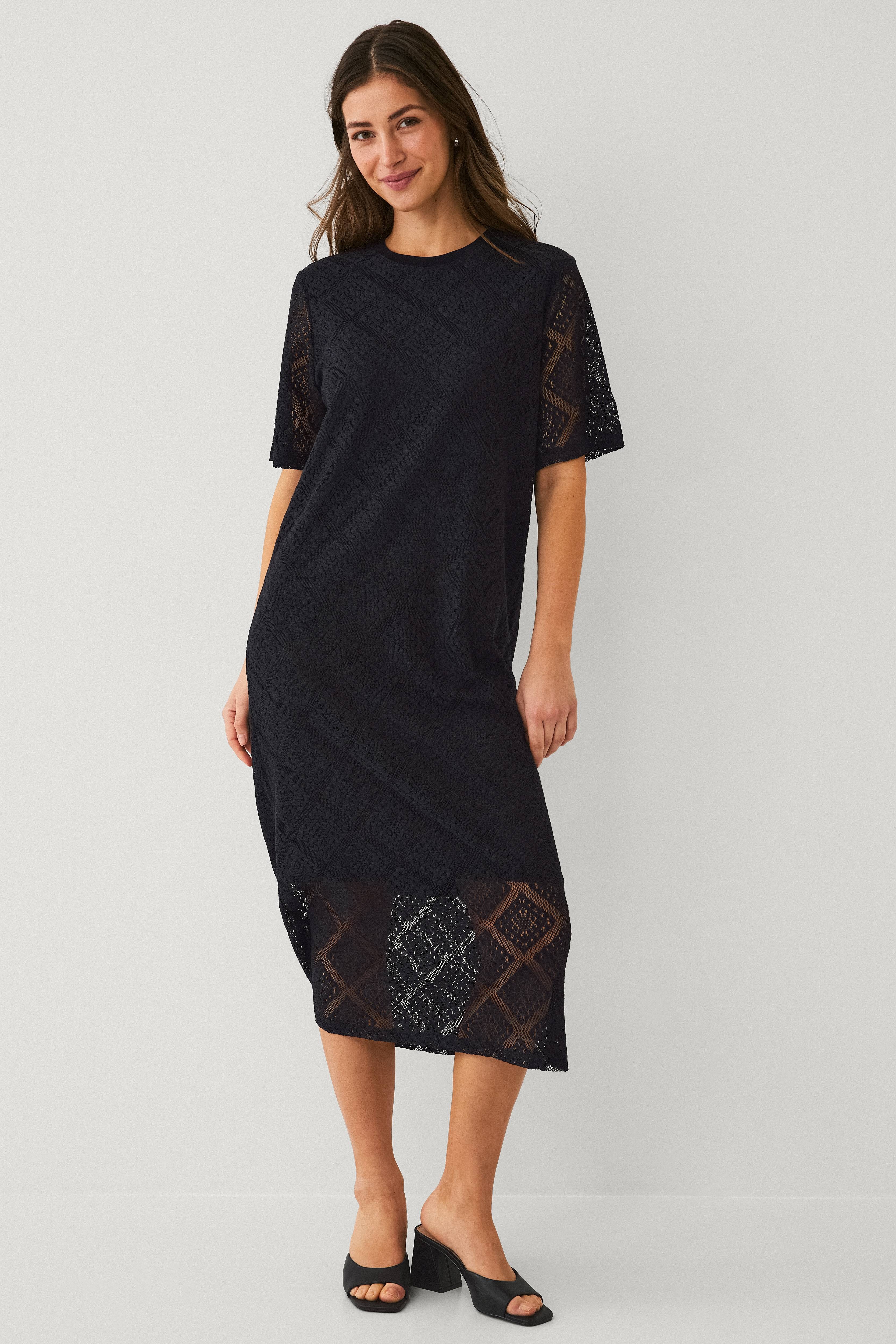 • Foret blondekjole• Pasform• Rund halsudskæring med ribbet kant• Korte ærmer• Elastisk for• Længde: 125 cm i størrelse S