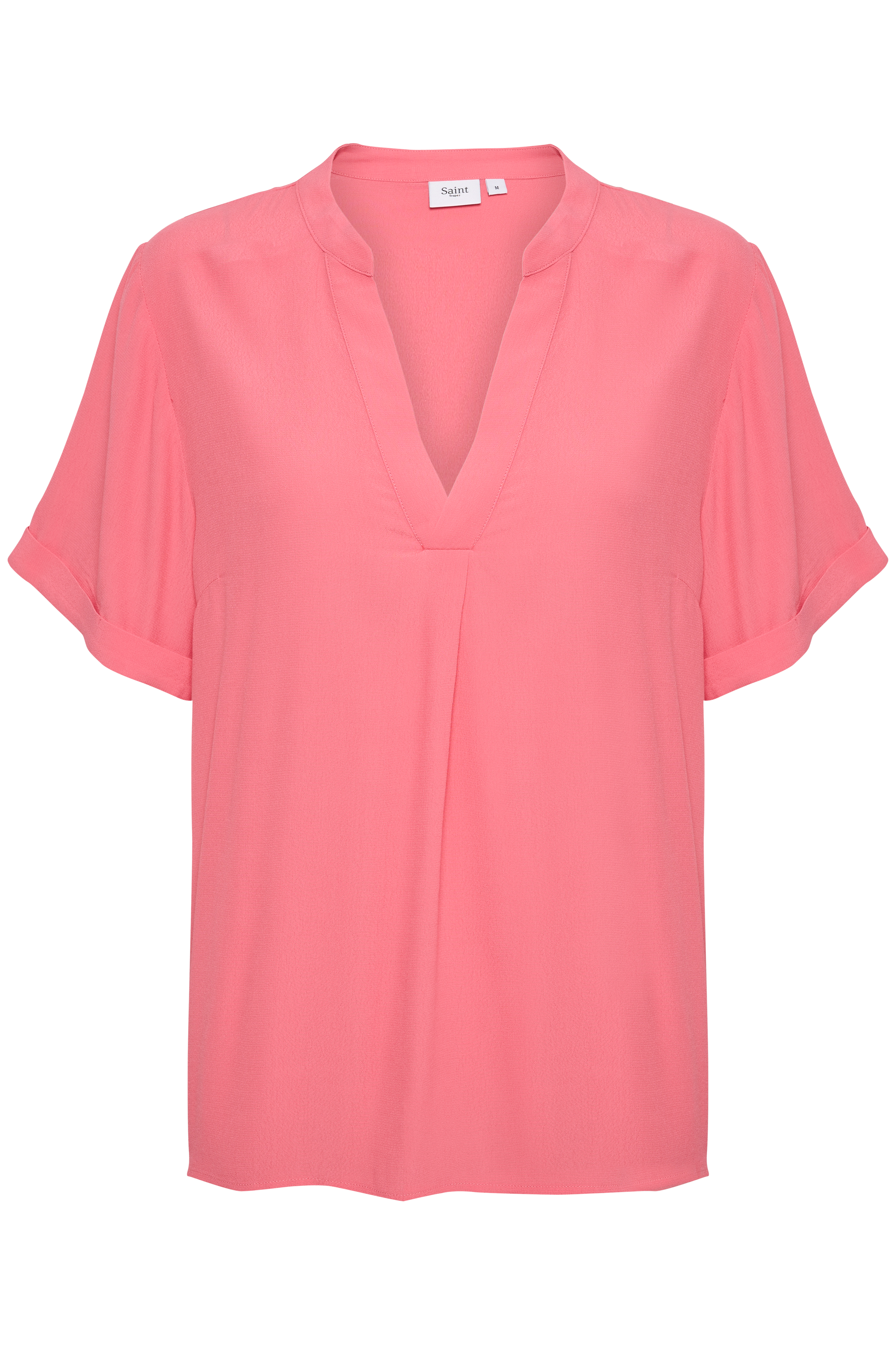 Bluse AgnesSZ SS Top fra Saint Tropez med V-udskæring og lagt læg foran. Korte ærmer med opslag. Fremstillet i tynd crepet kvalitet.