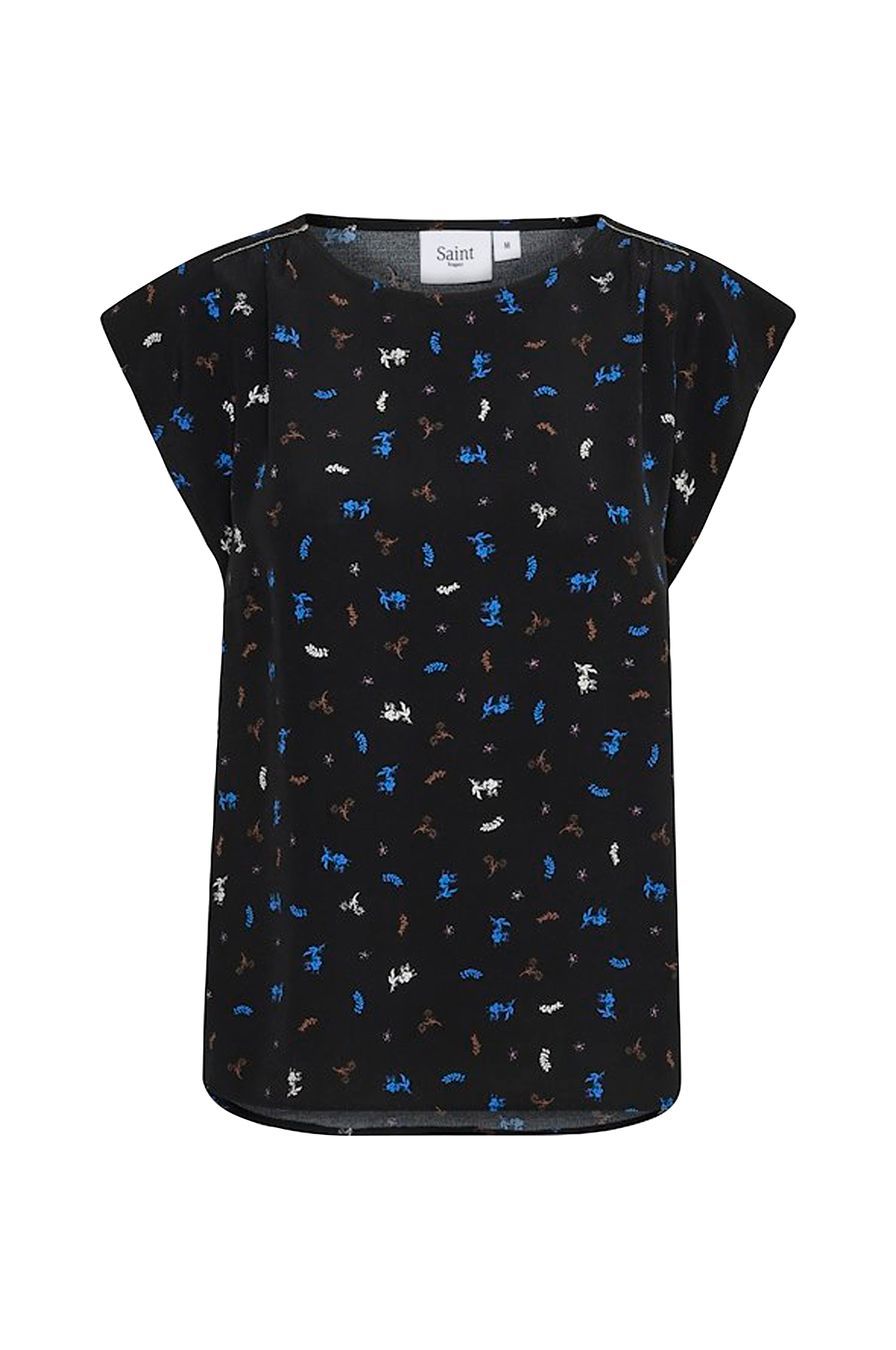 Bluse BlancaSZ Adele SS Top fra Saint Tropez med korte ærmer og diskret sølvfarvet tråd på skuldrene. Løs pasform.