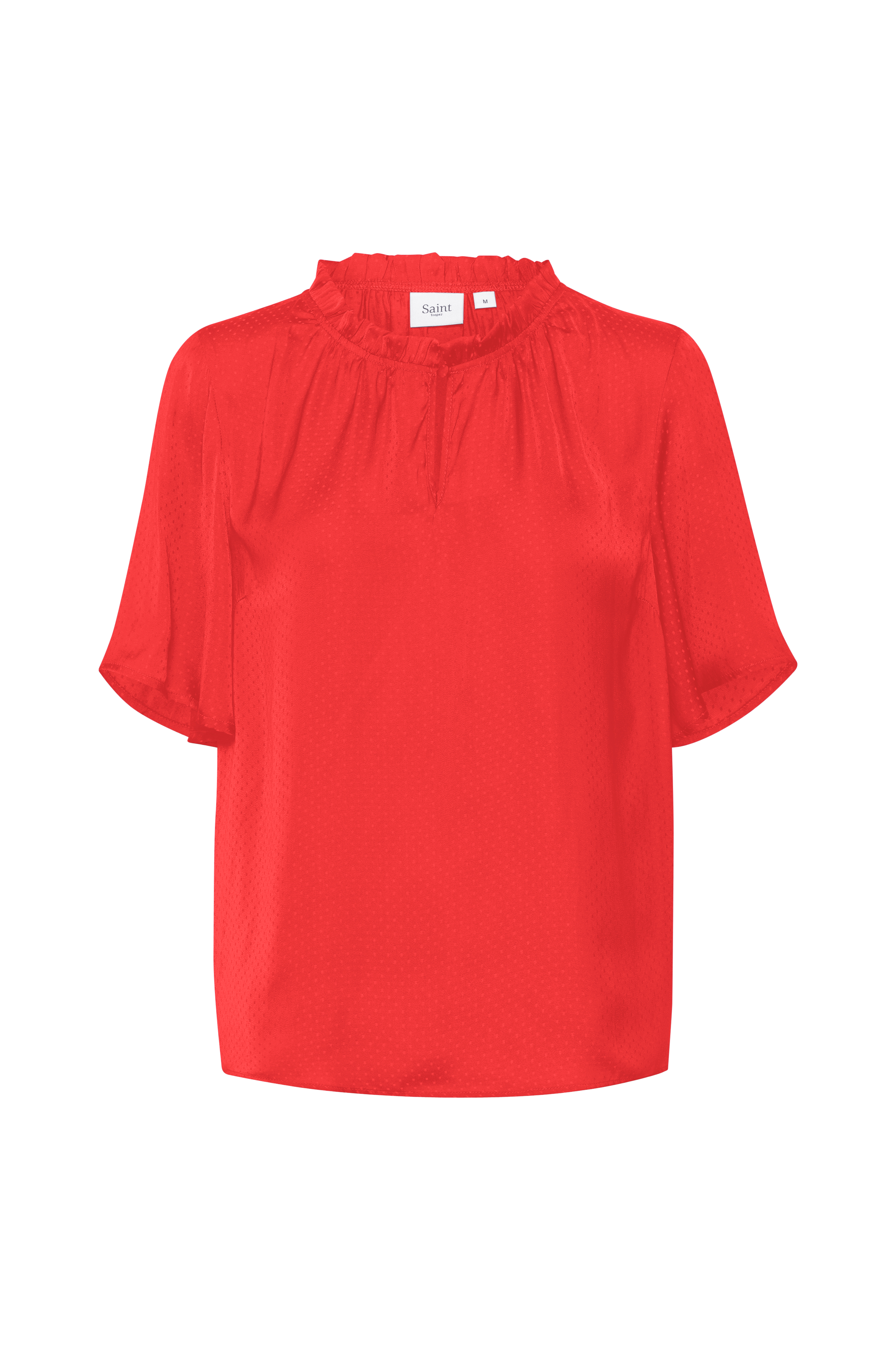 • Bluse med printet prikmønster• Rund halsudskæring med kort flæsekant hele vejen rundt• Ventilation med knap foran• Rynkede detaljer oppe foran og oppe bagved• Kort ærme